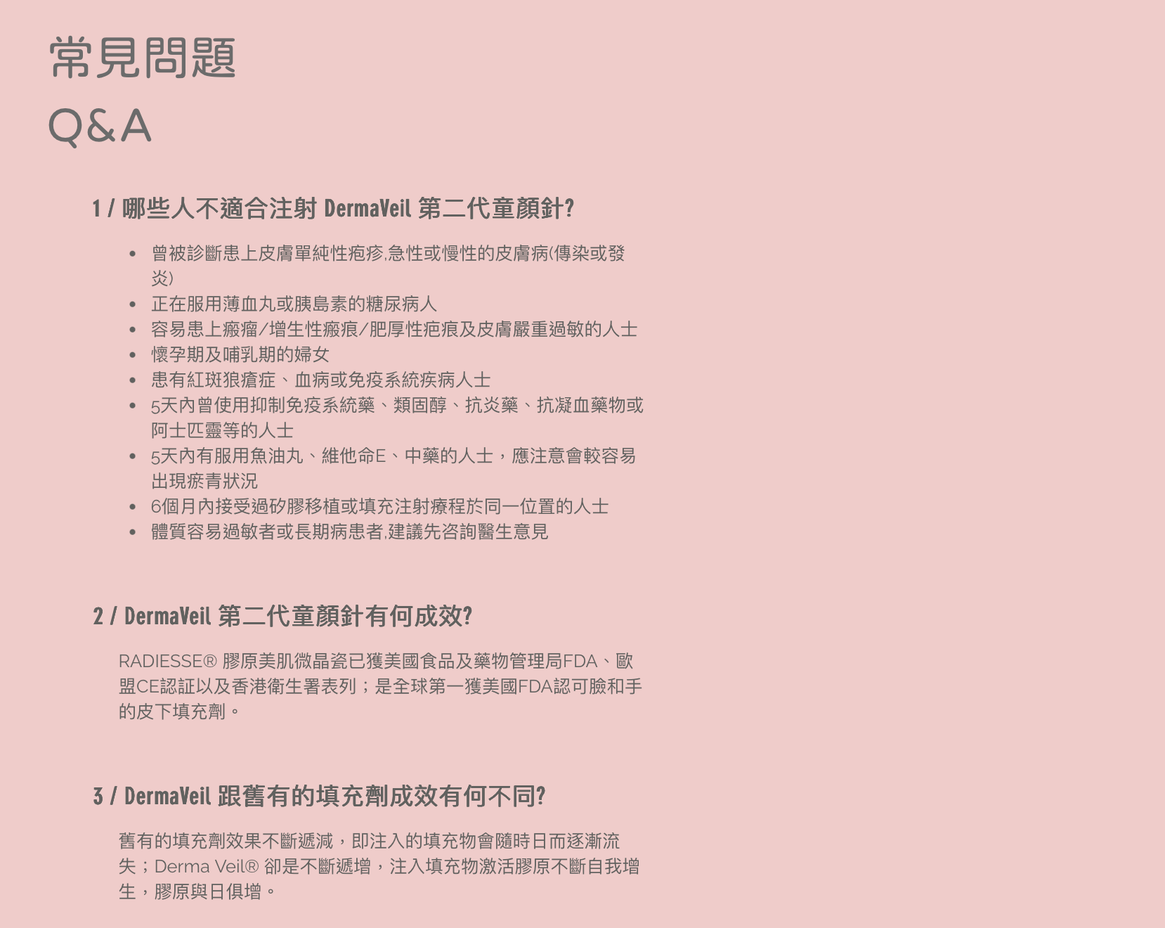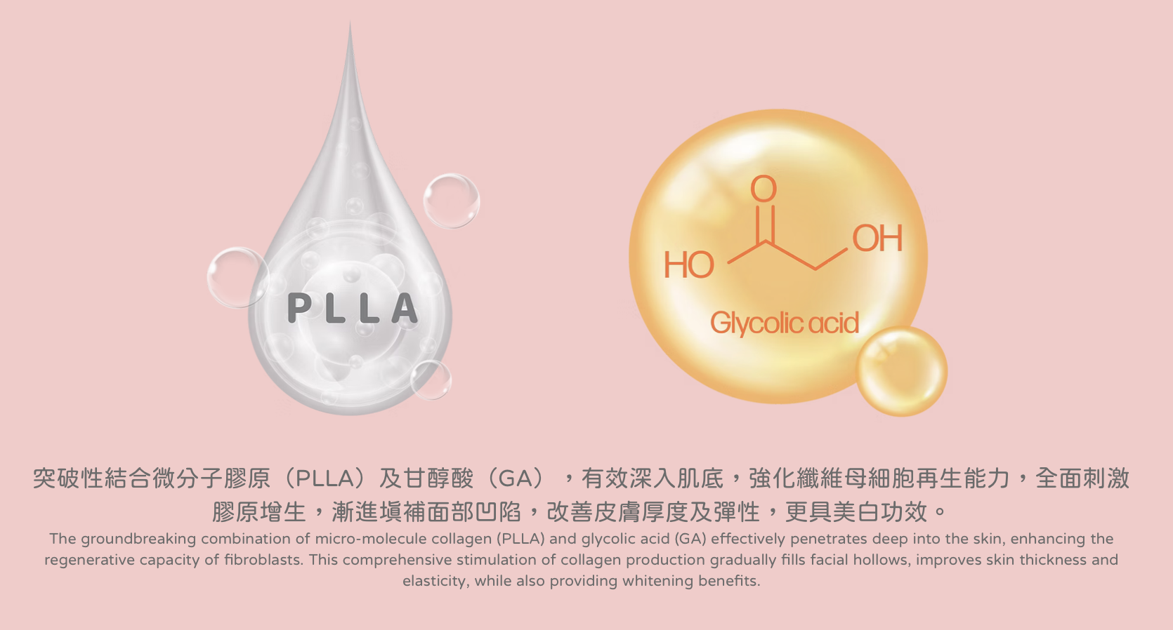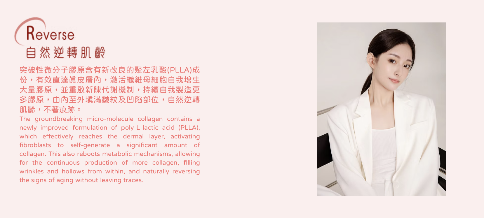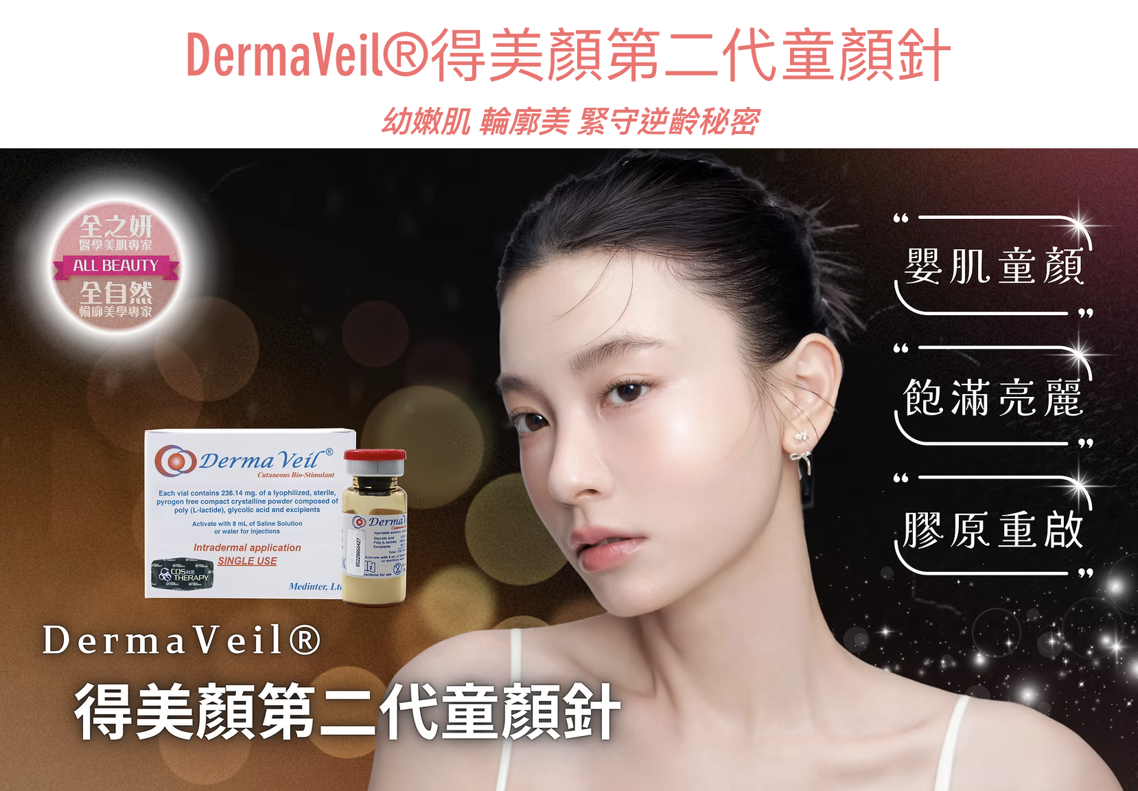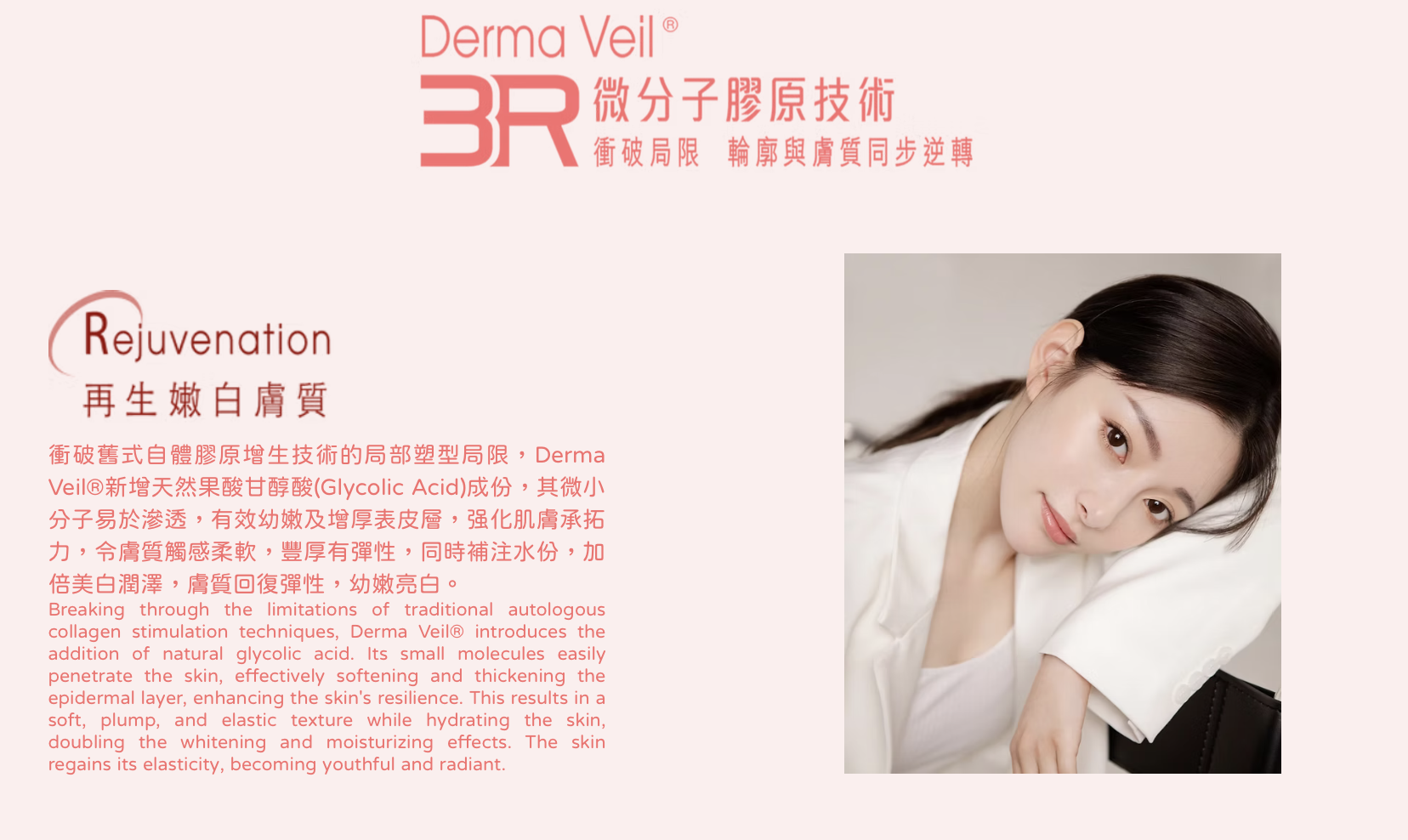 嫩滑飽滿的肌膚,有賴真皮層內充足的膠原,而生產膠原的就是纖維母細胞。隨著年齡增長,骨膠原因纖維母細胞新陳代謝放緩而大大減少,支撐力逐漸疏鬆,成為肌膚老化的主要原因,因而皮膚下垂,失去彈力,出現皺紋、凹陷鬆弛等問題。Derma Veil®第二代童顏膠原自生劑採用「3R微分子膠原技術」深入真皮層,激活強化纖維母細胞的生產動力,令膠原大量增生,由內至外飽滿皮膚及嫩化膚質,塑造出自然而立體輪廓。集改善膚質及調整面形輪廓的功效於一身,效果自然而持久,因而是針劑療程的入門之選。