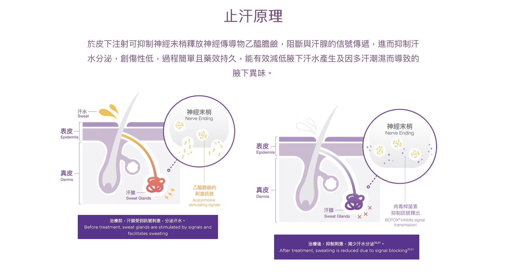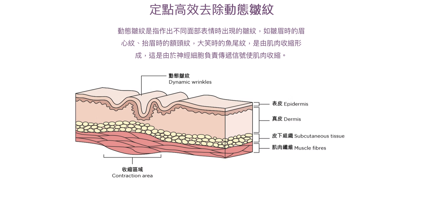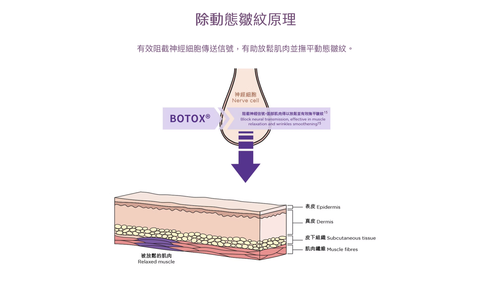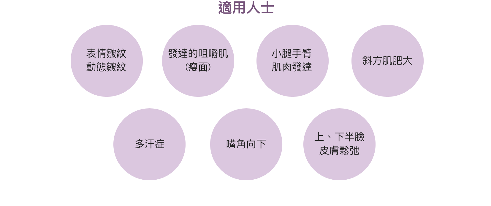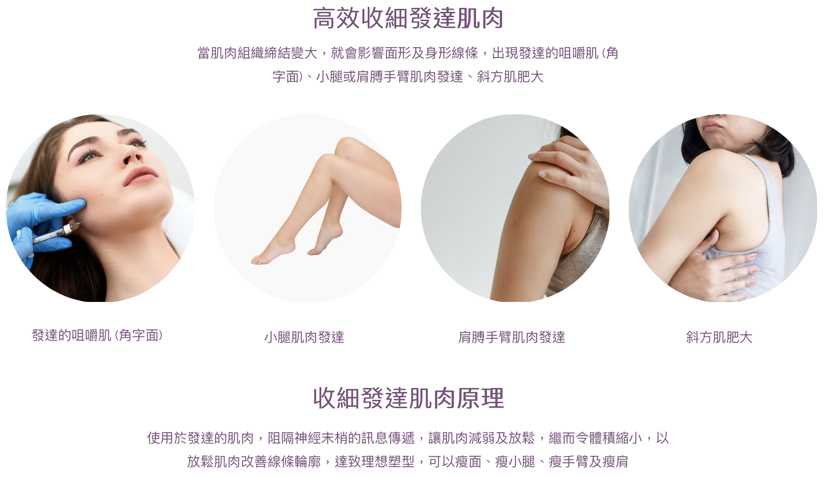 減弱肌肉的活動,導致肌肉逐漸萎縮,咀嚼肌體積減小,繼而達到瘦面效果;另外亦可減弱降肌向下的下墜力,增加提肌向上的拉力,從而重建面部肌肉之間的平衡關係,以提升鬆弛下垂面部。