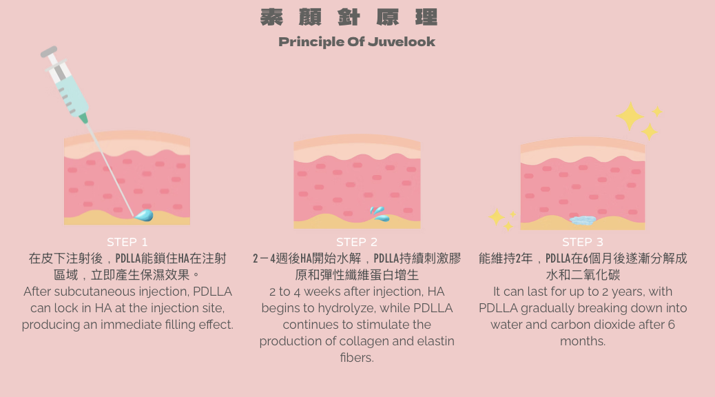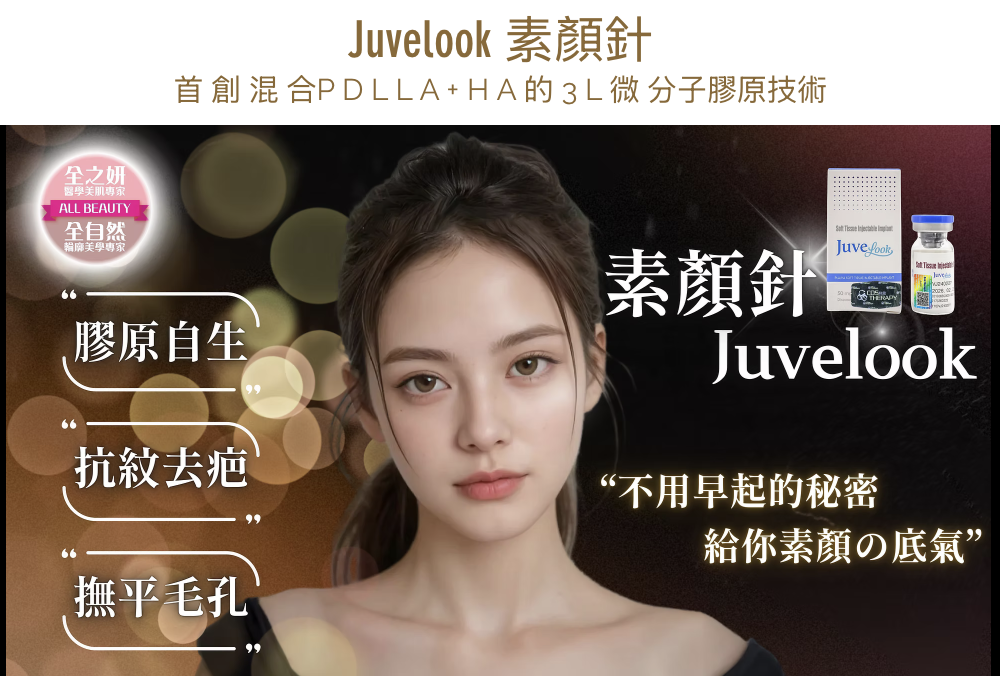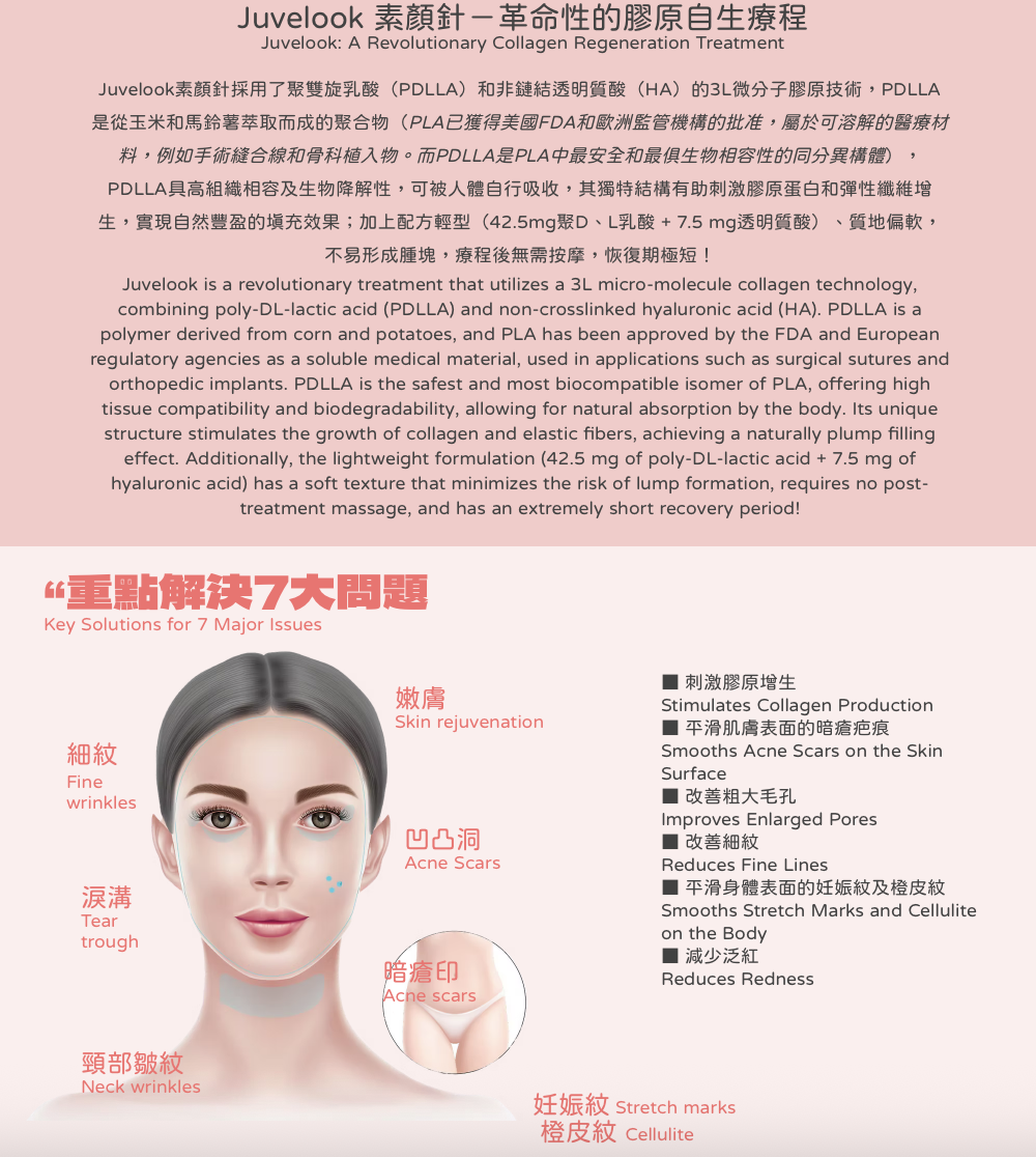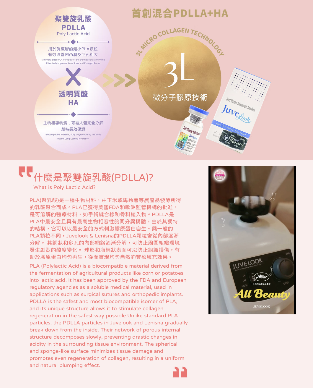 Juvelook素顏針採用了聚雙旋乳酸(PDLLA)和非鏈結透明質酸(HA)的3L微分子膠原技術,PDLLA是從玉米和馬鈴薯萃取而成的聚合物(PLA已獲得美國FDA和歐洲監管機構的批准,屬於可溶解的醫療材料,例如手術縫合線和骨科植入物。而PDLLA是PLA中最安全和最俱生物相容性的同分異構體),PDLLA具高組織相容及生物降解性,可被人體自行吸收,其獨特結構有助刺激膠原蛋白和彈性纖維增生,實現自然豐盈的填充效果;加上配方輕型(42.5mg聚D、L乳酸 + 7.5 mg透明質酸)、質地偏軟,不易形成腫塊,療程後無需按摩,恢復期極短!