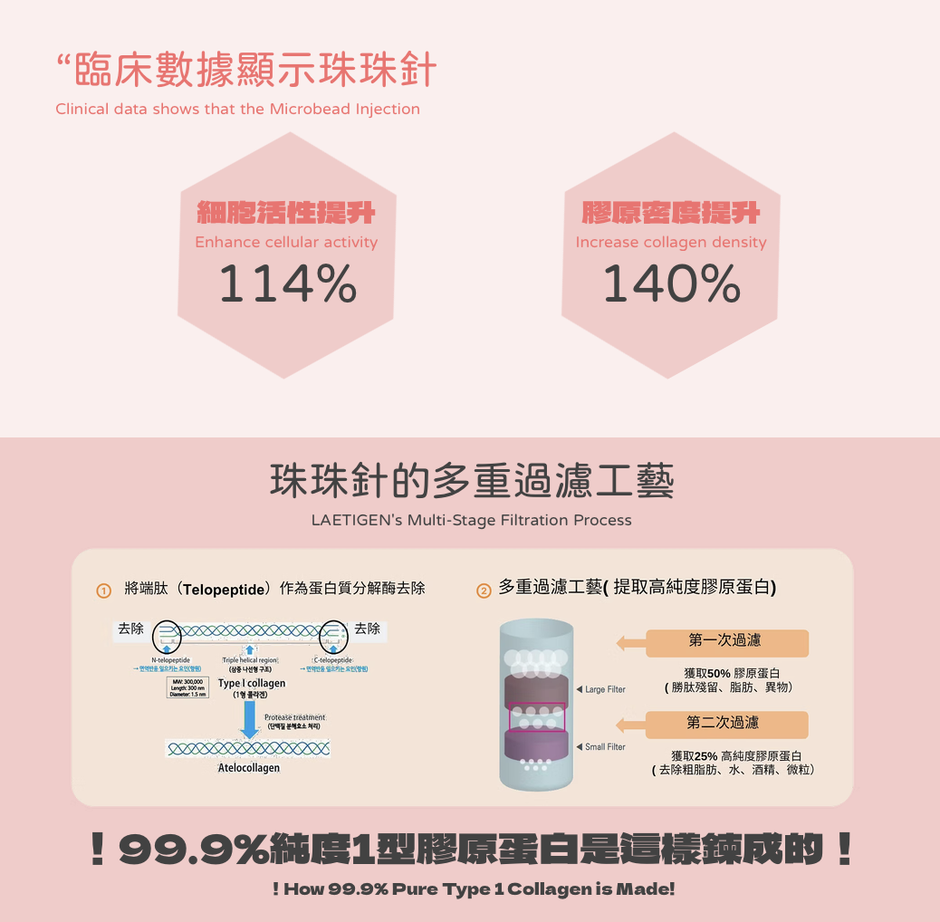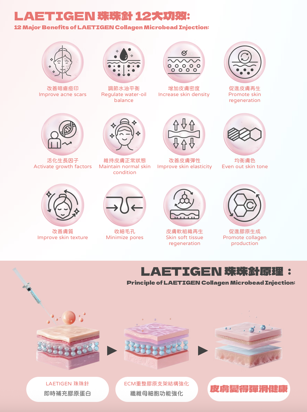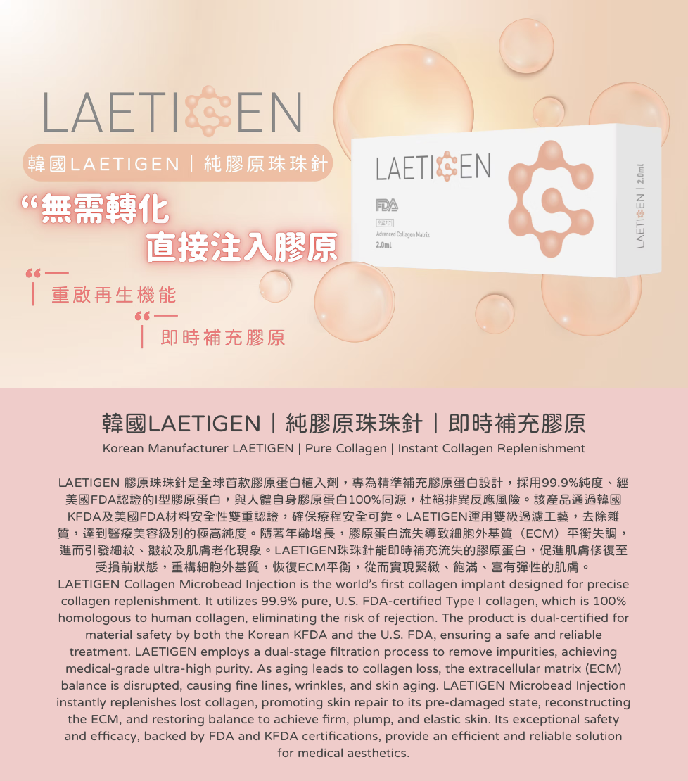 LAETIGEN 膠原珠珠針是全球首款膠原蛋白植入劑,專為精準補充膠原蛋白設計,採用99.9%純度、經美國FDA認證的I型膠原蛋白,與人體自身膠原蛋白100%同源,杜絕排異反應風險。該產品通過韓國KFDA及美國FDA材料安全性雙重認證,確保療程安全可靠。LAETIGEN運用雙級過濾工藝,去除雜質,達到醫療美容級別的極高純度。隨著年齡增長,膠原蛋白流失導致細胞外基質(ECM)平衡失調,進而引發細紋、皺紋及肌膚老化現象。LAETIGEN珠珠針能即時補充流失的膠原蛋白,促進肌膚修復至受損前狀態,重構細胞外基質,恢復ECM平衡,從而實現緊緻、飽滿、富有彈性的肌膚。