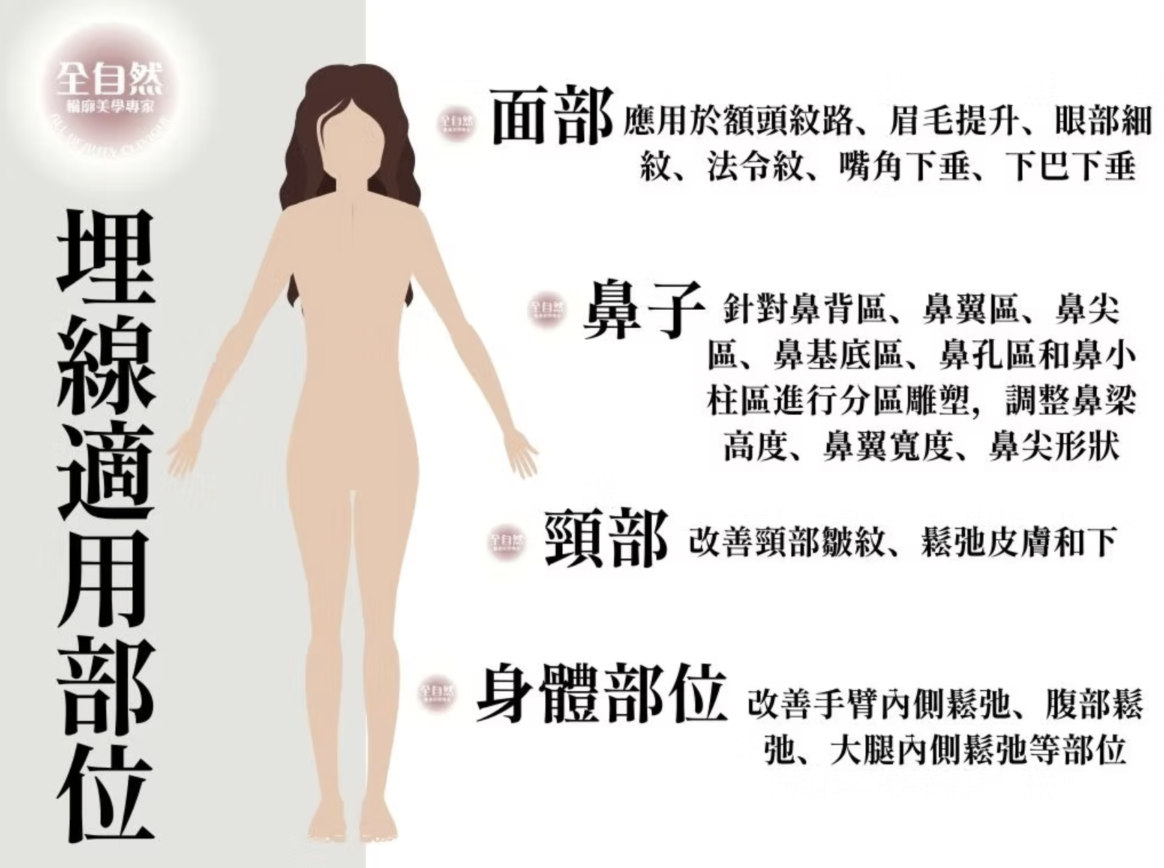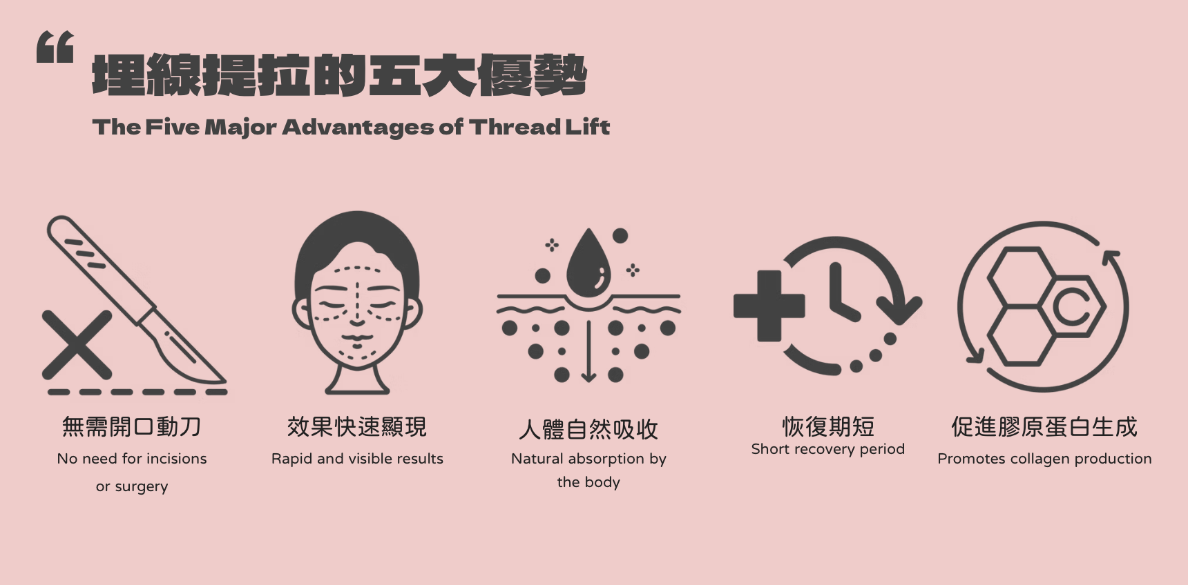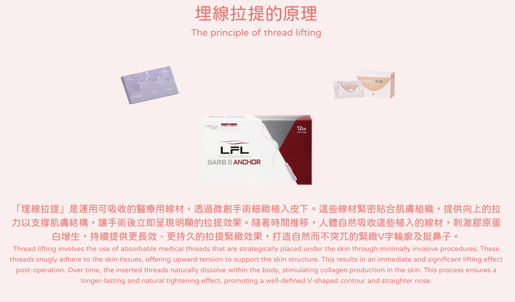 埋線拉提使用可吸收的醫療線材來提供臉部或身體皮膚的拉提效果。這些線材會在微創手術中埋入皮下組織,並通過與組織的結合提供向上的拉力,以改善皮膚的鬆弛和下垂情況。這些線材是由可吸收的材料製成,它們會在時間的推移中被人體吸收。同時,這些線材在被吸收的過程中會刺激膠原蛋白的生成,進一步改善皮膚的緊緻度和彈性。這種刺激作用有助於提供更長效的拉提效果,並且在線材被完全吸收後,皮膚仍然可以保持較好的緊緻狀態。