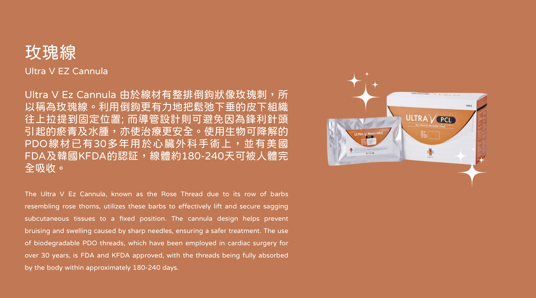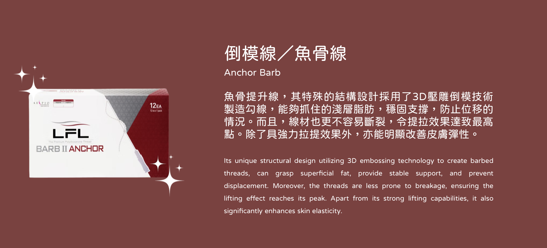 LFL ANCOR MAX 是一種由PCL(聚己內酯)製成的優質蛋白線。它具有高伸展強度和柔韌性,非常不容易斷裂。透過將PCL蛋白線注入皮膚組織中,可以激活周圍細胞,刺激膠原蛋白再生,重建彈性纖維蛋白結構,從而提升肌膚彈性,達到收緊和提升輪廓的效果。