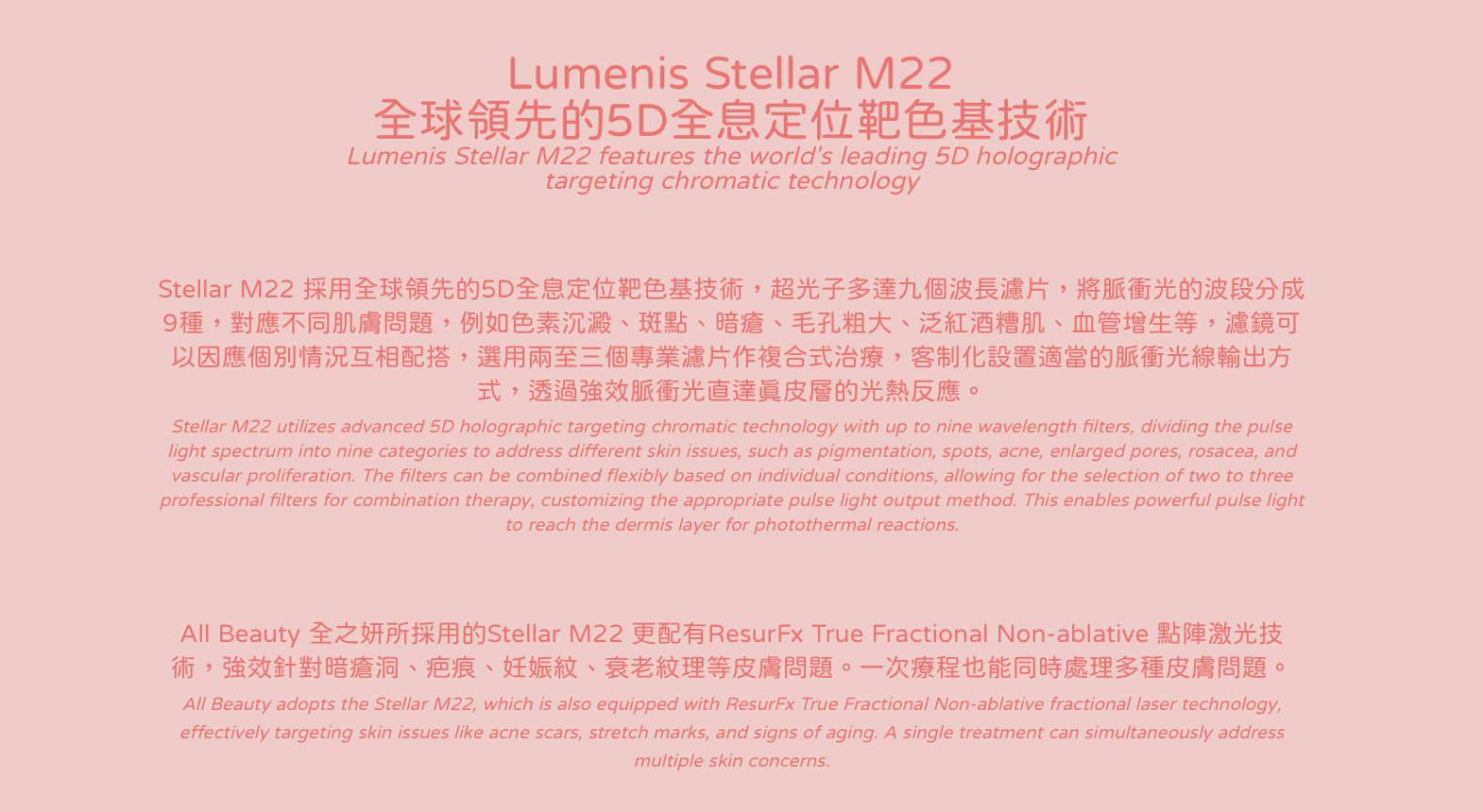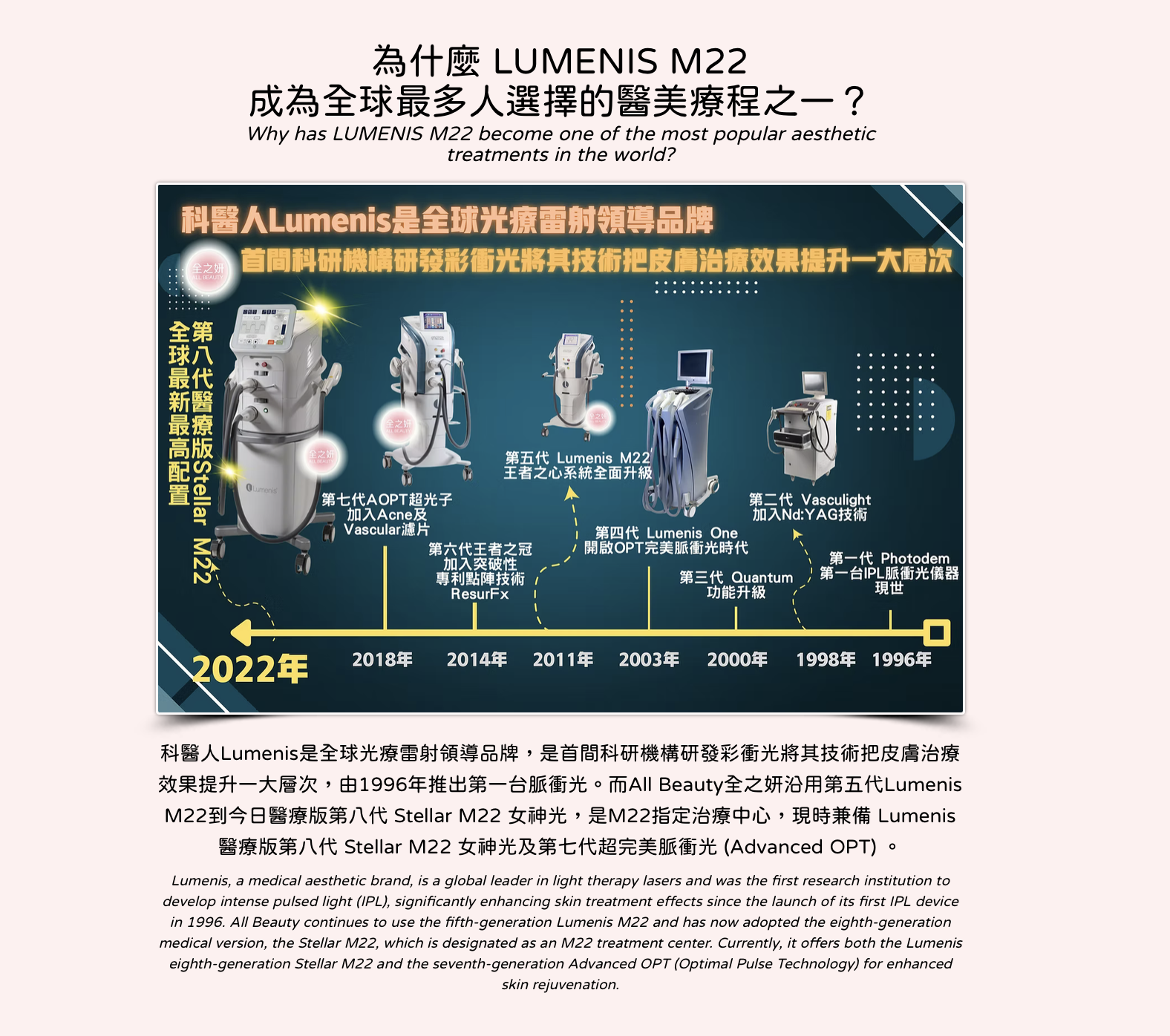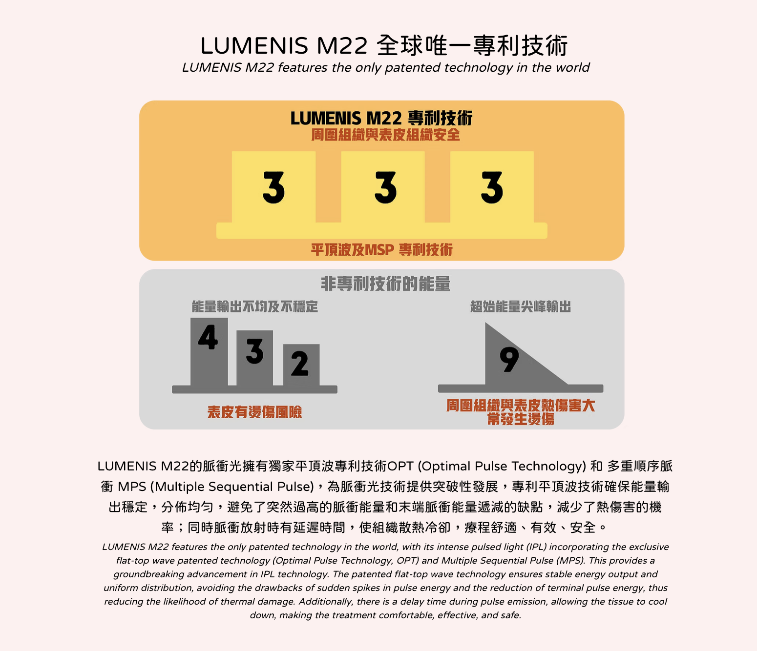 Lumenis 醫療版第八代Stellar M22 超完美脈衝女神光 (光子嫰膚) 獲美國食品及藥物管理局 FDA 認可及 CE 歐盟認證,可按不同膚質的需要,設置適當的脈衝光線輸出方式,分別針對三大靶色基,以黑素色為目標解裂黑色素、以血紅白蛋為目標凝固血壁管、以水子分為目標刺激膠原增生。