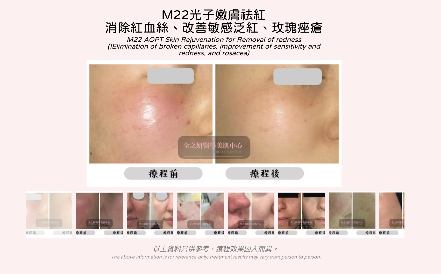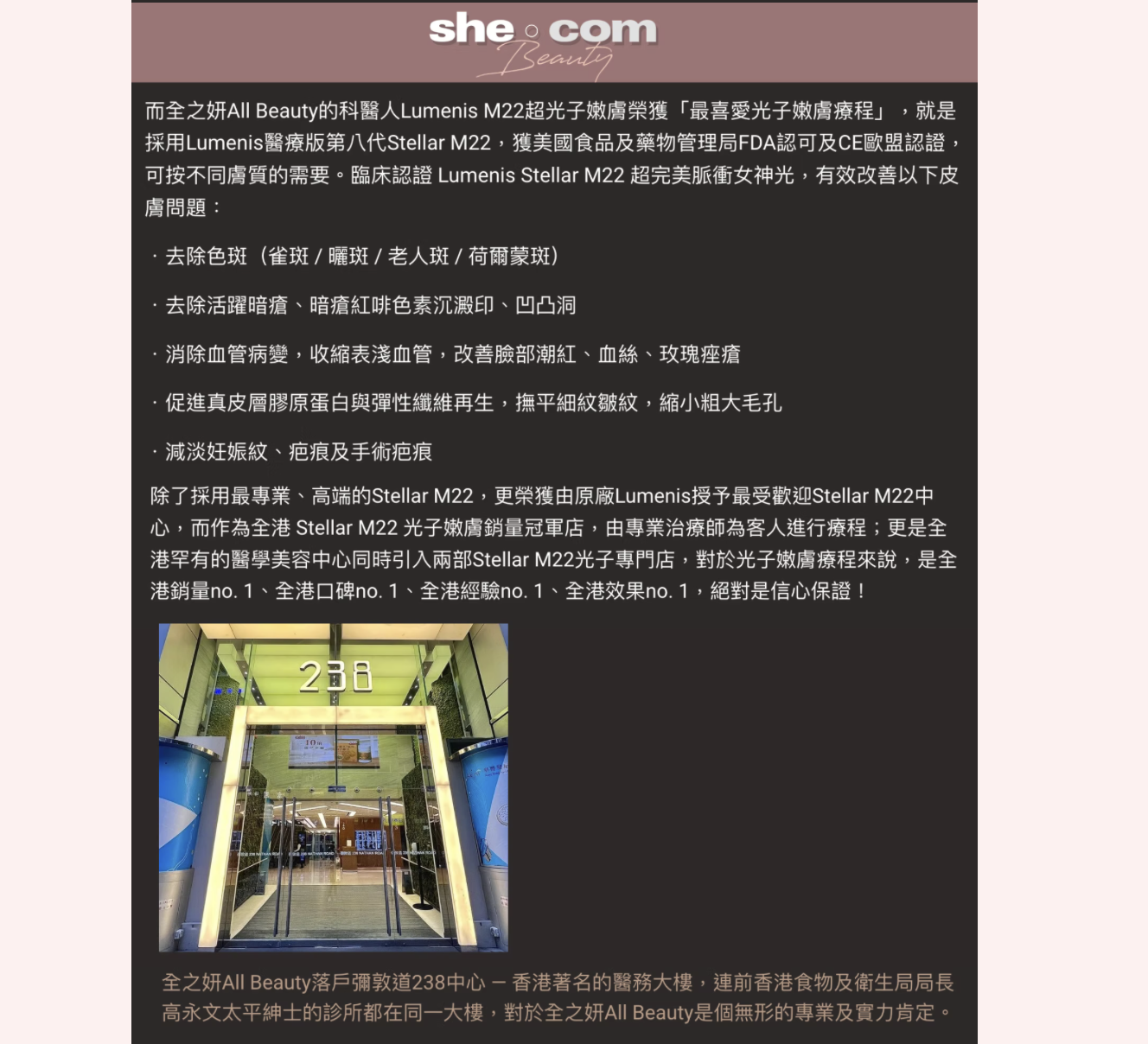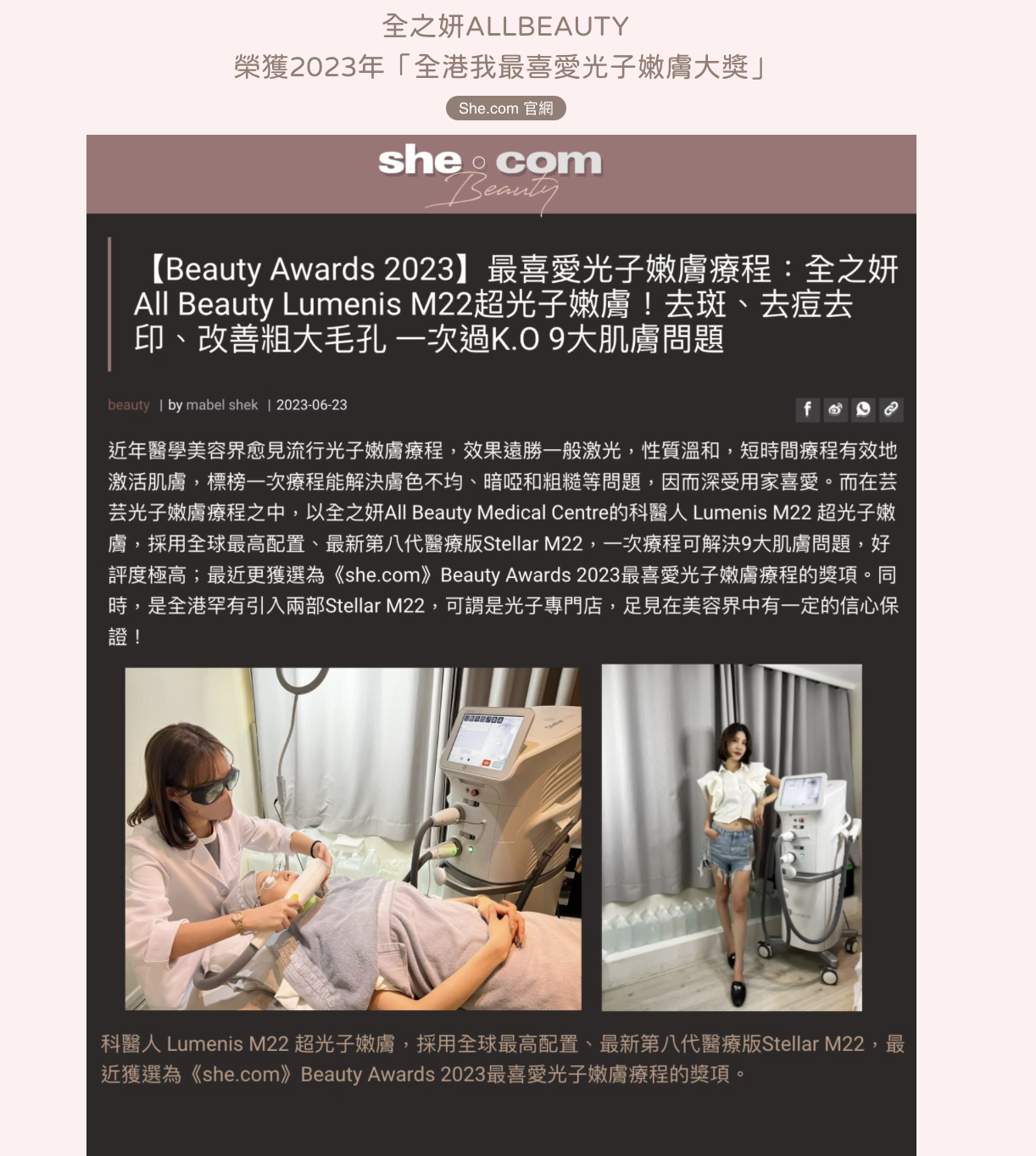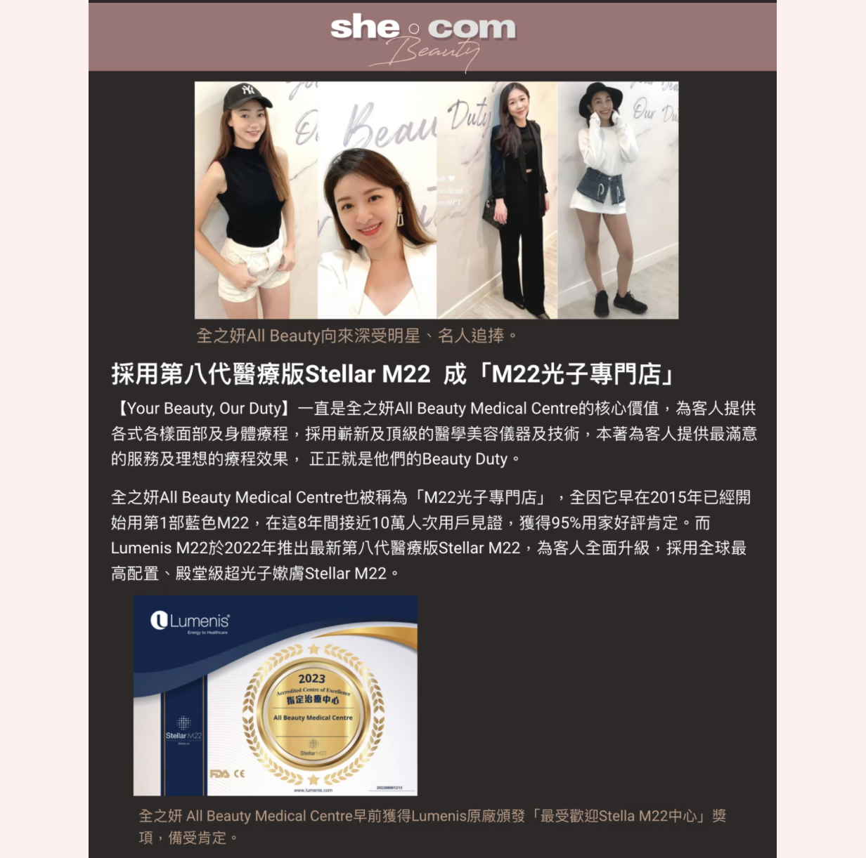 Lumenis 醫療版第八代Stellar M22 超完美脈衝女神光 (光子嫰膚) 獲美國食品及藥物管理局 FDA 認可及 CE 歐盟認證,可按不同膚質的需要,設置適當的脈衝光線輸出方式,分別針對三大靶色基,以黑素色為目標解裂黑色素、以血紅白蛋為目標凝固血壁管、以水子分為目標刺激膠原增生。