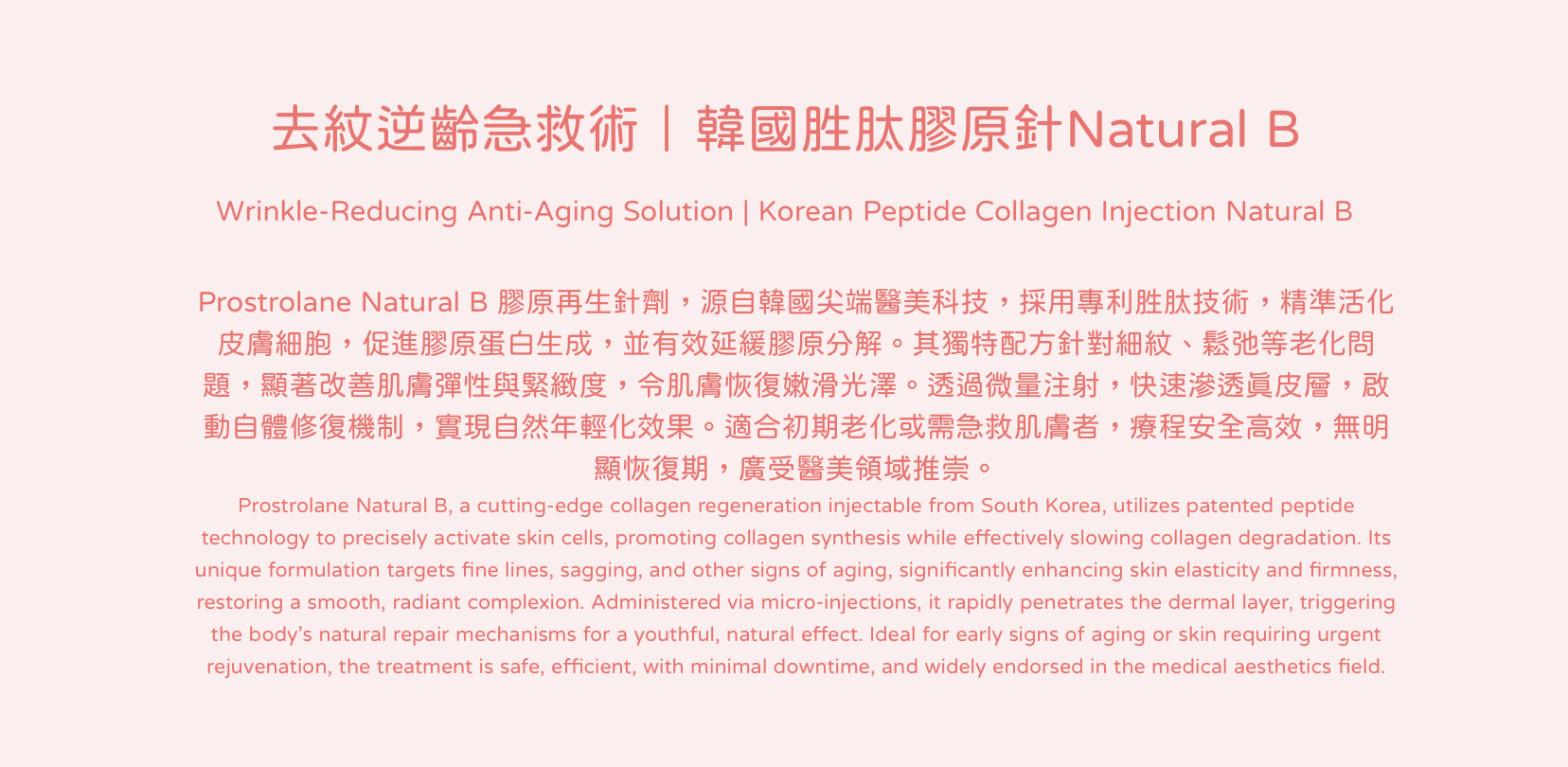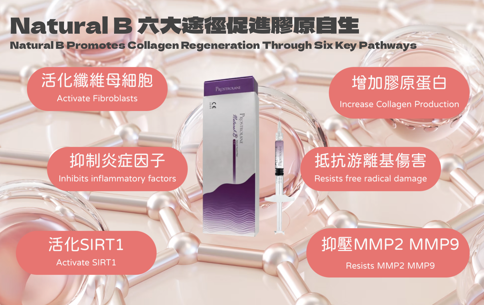 Prostrolane Natural B 膠原再生針劑,源自韓國尖端醫美科技,採用專利胜肽技術,精準活化皮膚細胞,促進膠原蛋白生成,並有效延緩膠原分解。其獨特配方針對細紋、鬆弛等老化問題,顯著改善肌膚彈性與緊緻度,令肌膚恢復嫩滑光澤。透過微量注射,快速滲透真皮層,啟動自體修復機制,實現自然年輕化效果。適合初期老化或需急救肌膚者,療程安全高效,無明顯恢復期,廣受醫美領域推崇。