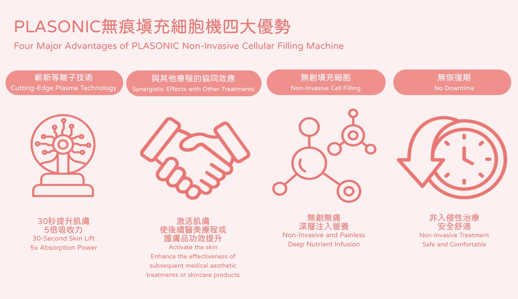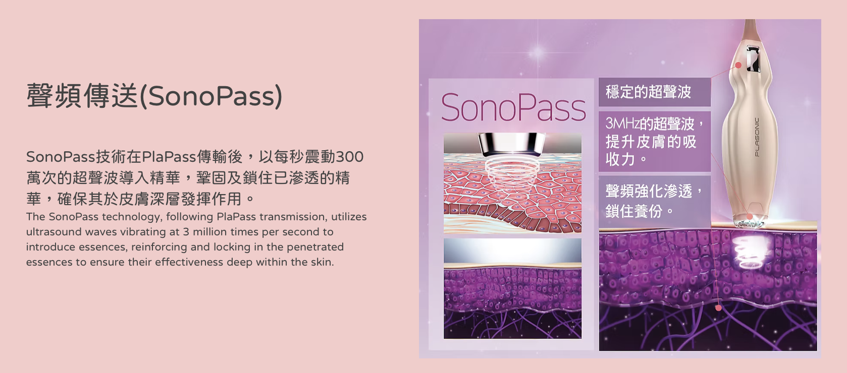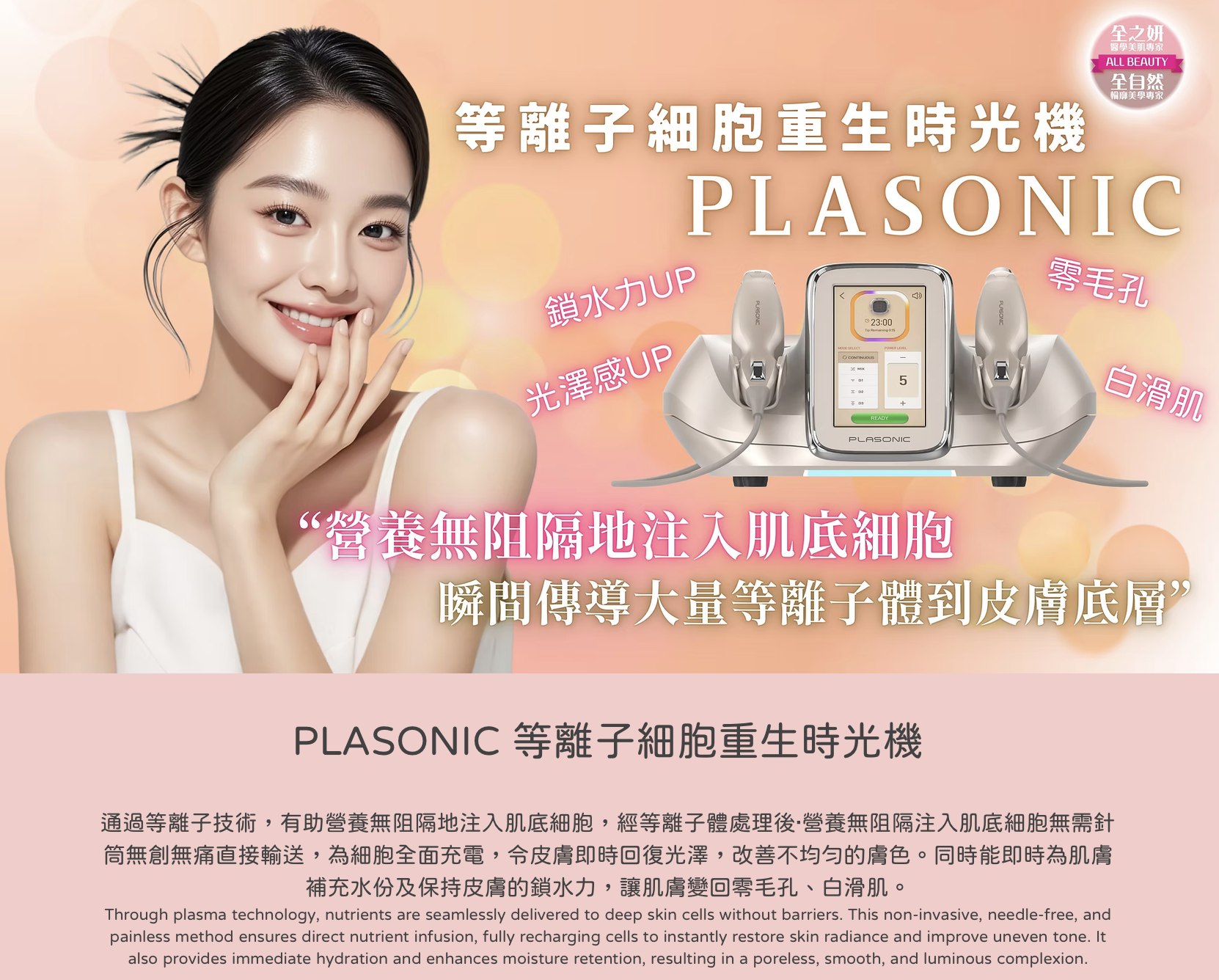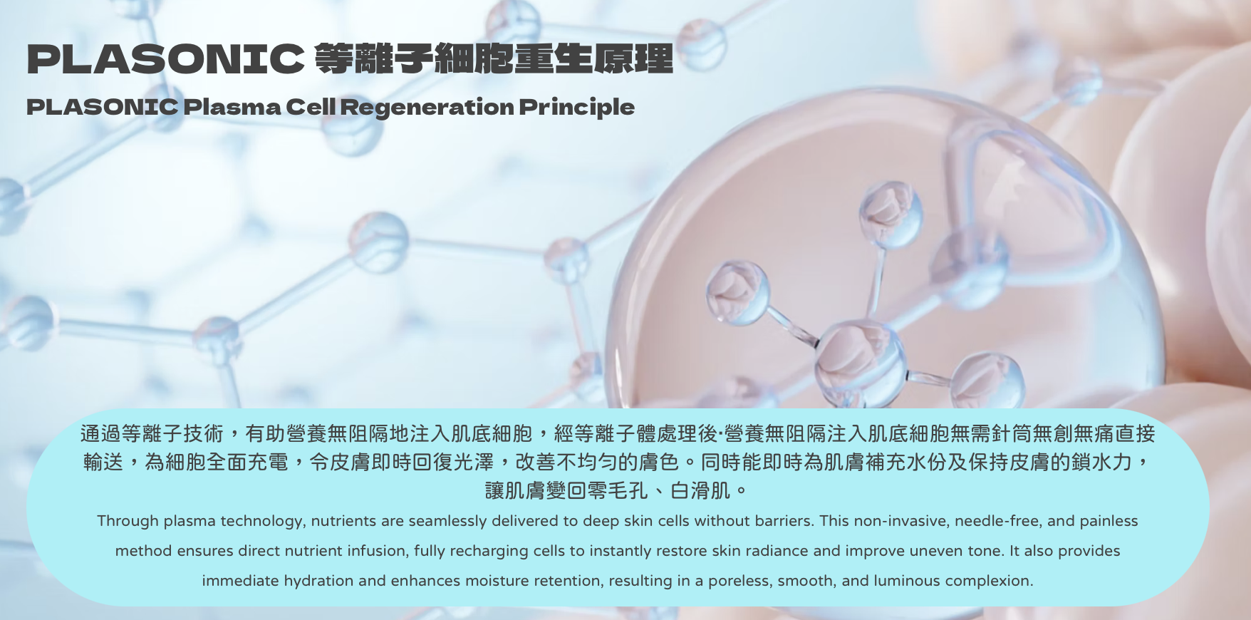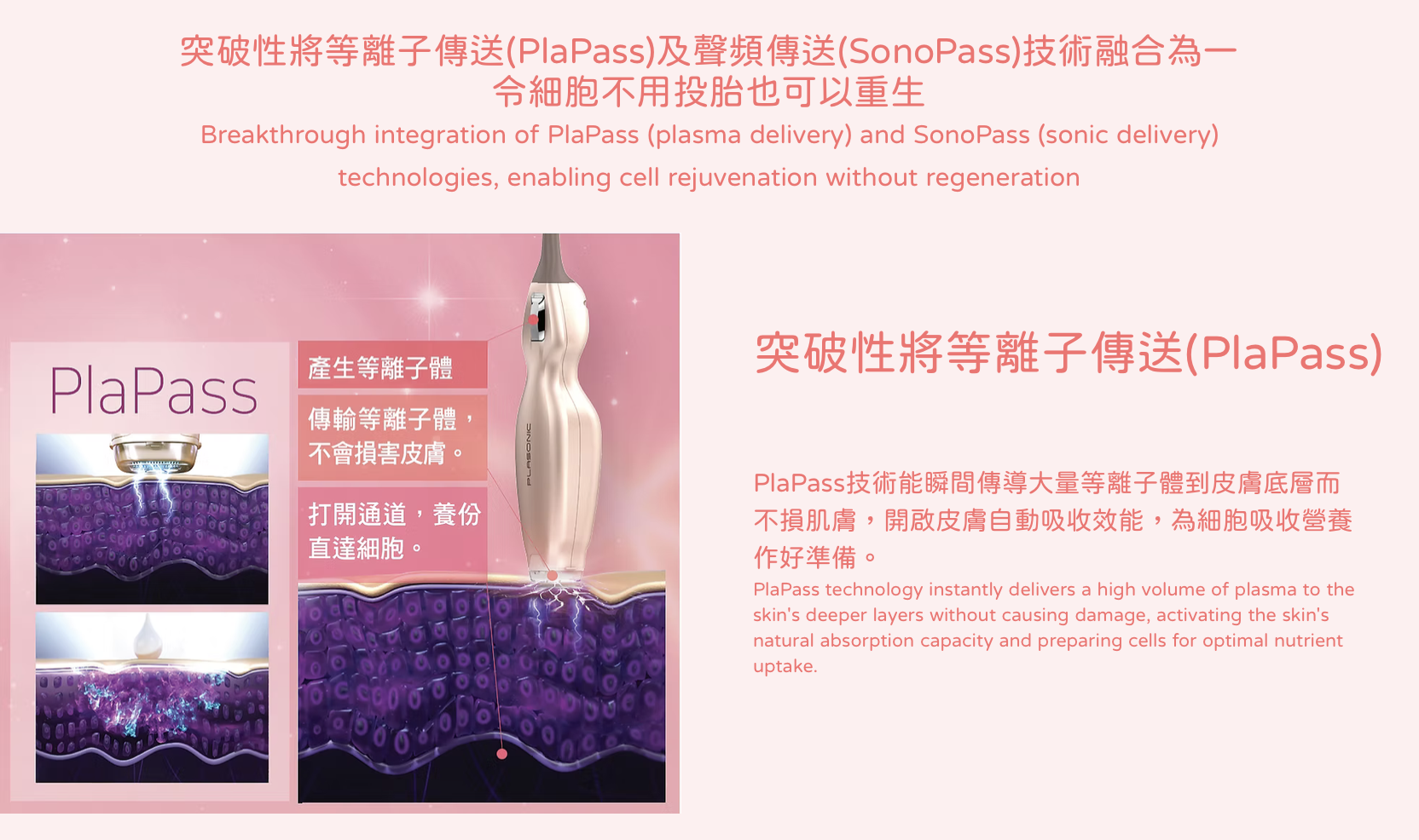 PLASONIC 等離子細胞重生時光機突破性將等離子傳送(PlaPass)及聲頻傳送(SonoPass)技術融合為一,令細胞唔洗投胎都可以重生。通過等離子技術,有助營養無阻隔地注入肌底細胞,經等離子體處理後‧營養無阻隔注入肌底細胞無需針筒無創無痛直接輸送,為細胞全面充電,令皮膚即時回復光澤,改善不均勻的膚色。同時能即時為肌膚補充水份及保持皮膚的鎖水力,讓肌膚變回零毛孔、白滑肌。