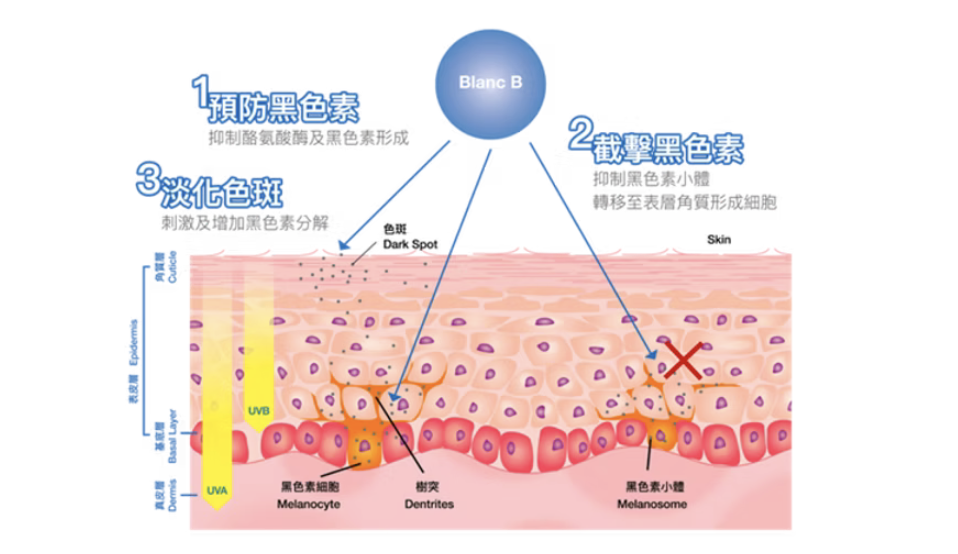 透過透明質酸為媒介,讓胜肽美白養份深入真皮層,強效對抗色素沉澱,加速黑色素降解淡斑,同時透過抑制酪氨酸酶 (Tyrosinase) 活躍度,減少黑色素轉移到表層的角質細胞,減少了UVB引起黑色素的形成;應用於中至深層真皮層,用於美白和均匀膚色,提升臉部和頸部光亮度,深入真皮層激發細胞再生,真正深層美白