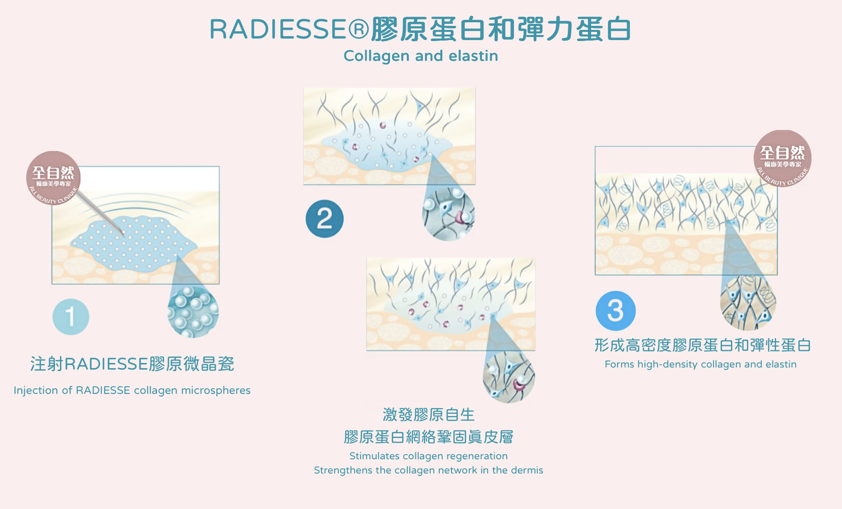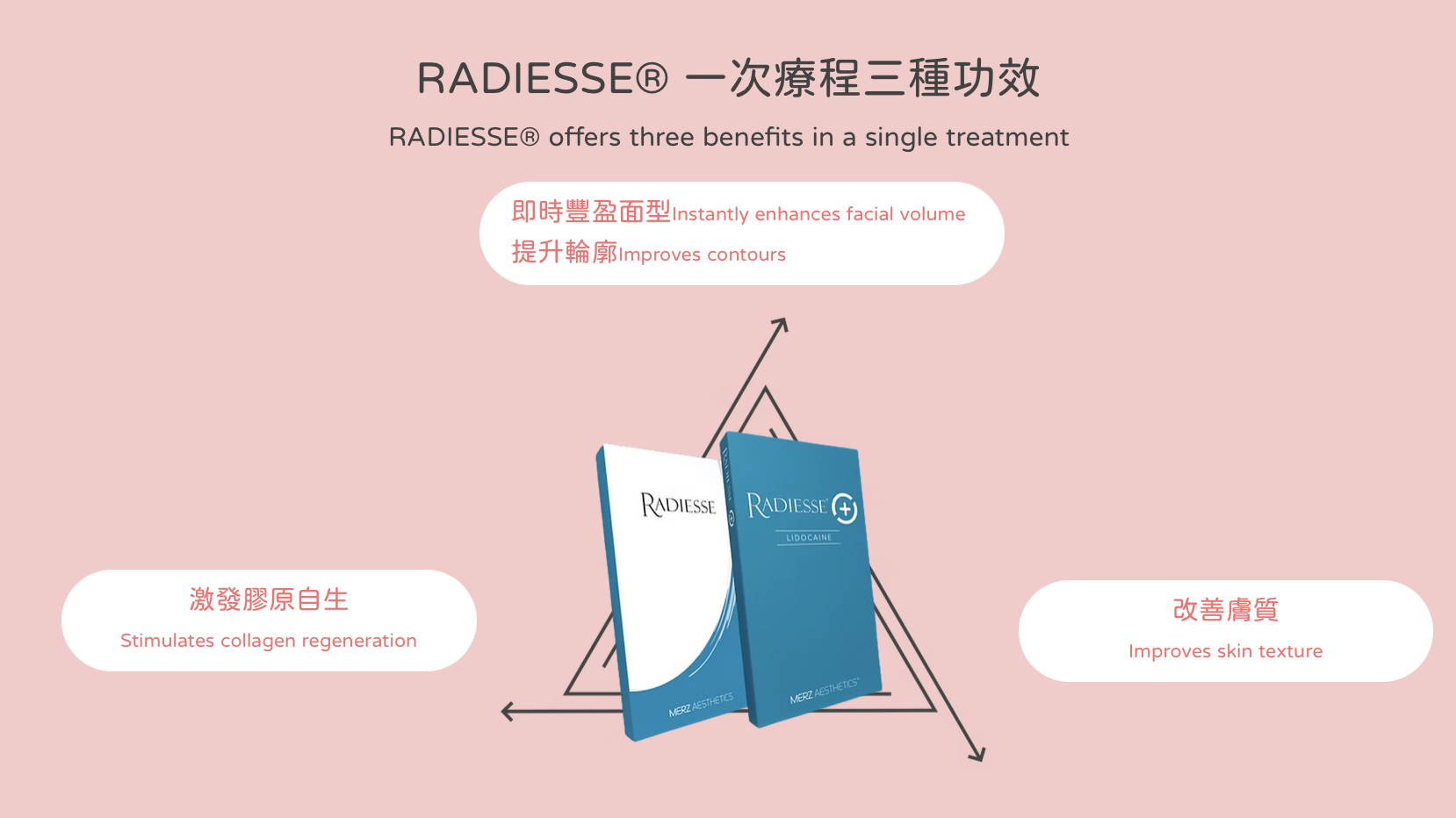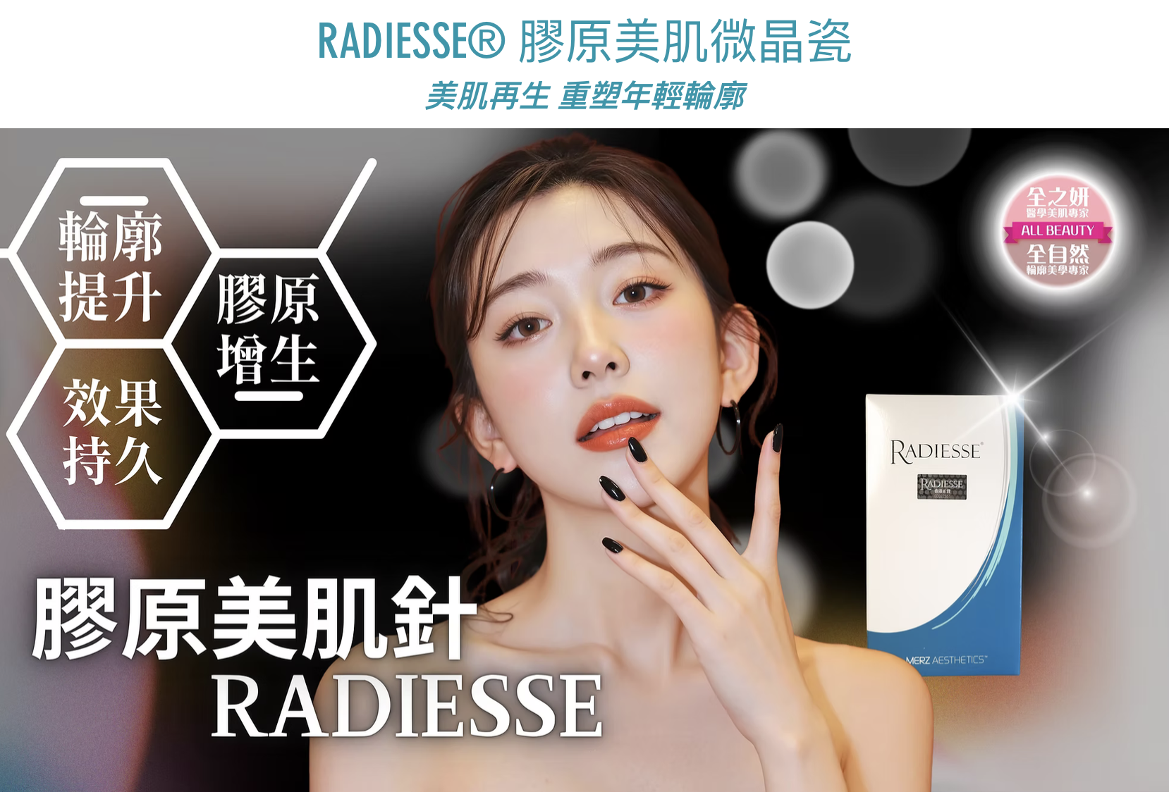 RADIESSE® 膠原美肌微晶瓷為全球首個獲美國FDA認可之面部及手部填充劑,注射後無需按摩,有效改善膚質彈性,豐盈臉型,優化輪廓,即時撫平皺紋,激活膠原再生,促進皮膚自身膠原蛋白及彈力蛋白生長,令肌底組織從內至外持續地得到改善。RADIESSE®膠原彈力針的成分可被人體代謝分解,臨床應用超過十年,相關研究已超過5,000宗個案,全球銷售超過1,000萬支*。