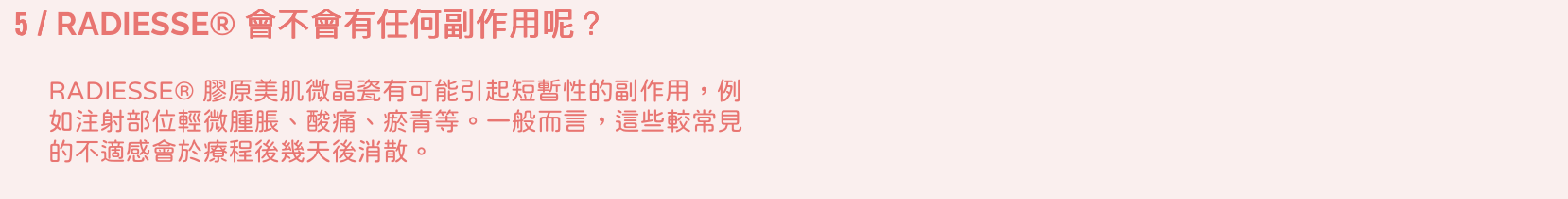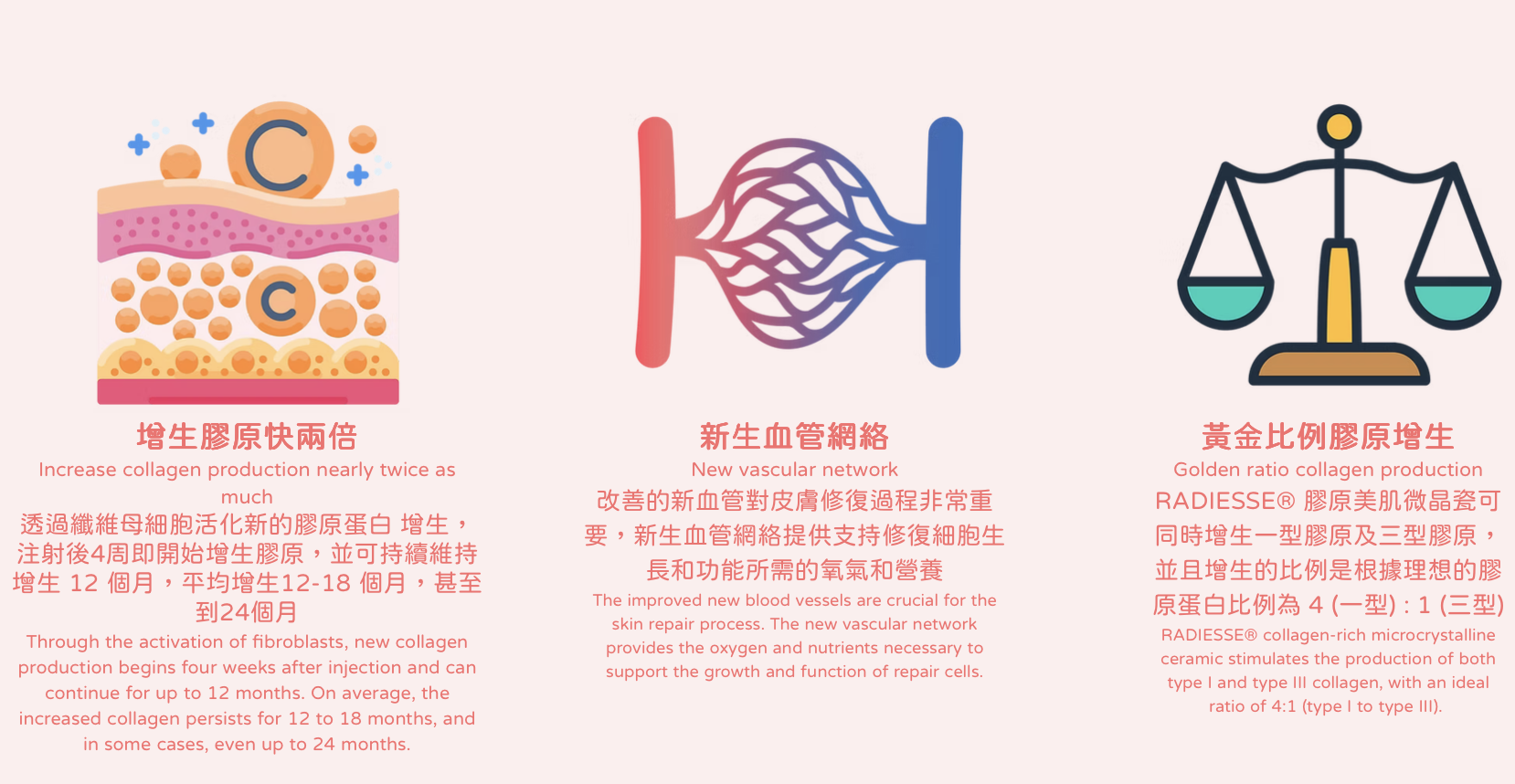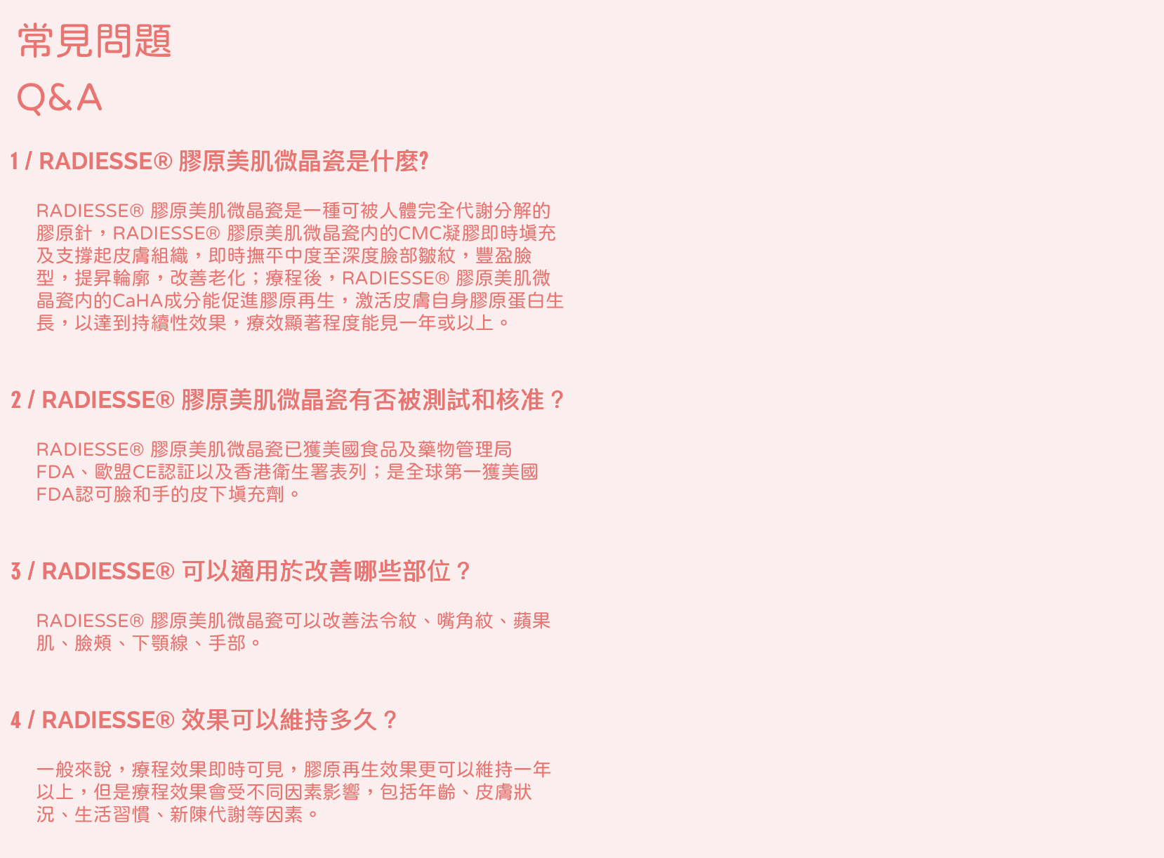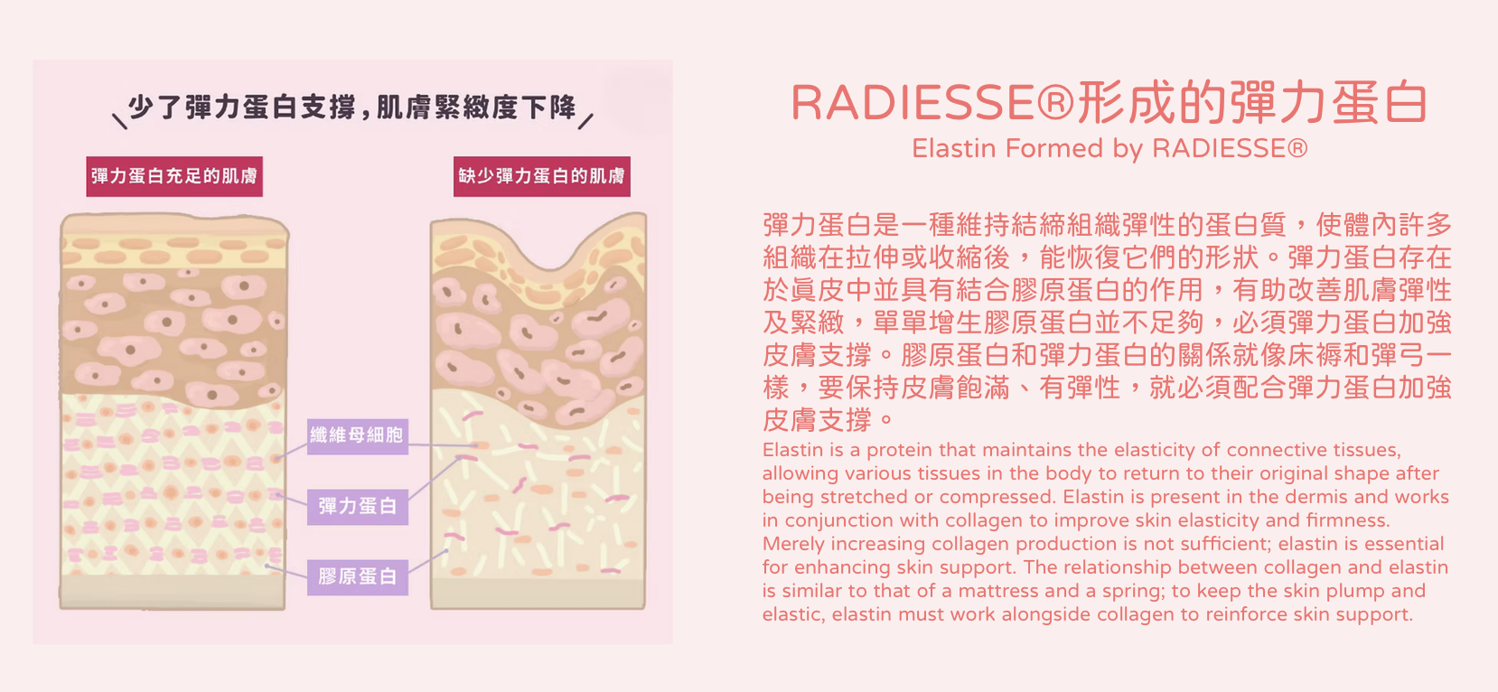 RADIESSE® 膠原美肌微晶瓷為全球首個獲美國FDA認可之面部及手部填充劑,注射後無需按摩,有效改善膚質彈性,豐盈臉型,優化輪廓,即時撫平皺紋,激活膠原再生,促進皮膚自身膠原蛋白及彈力蛋白生長,令肌底組織從內至外持續地得到改善。RADIESSE®膠原彈力針的成分可被人體代謝分解,臨床應用超過十年,相關研究已超過5,000宗個案,全球銷售超過1,000萬支*。