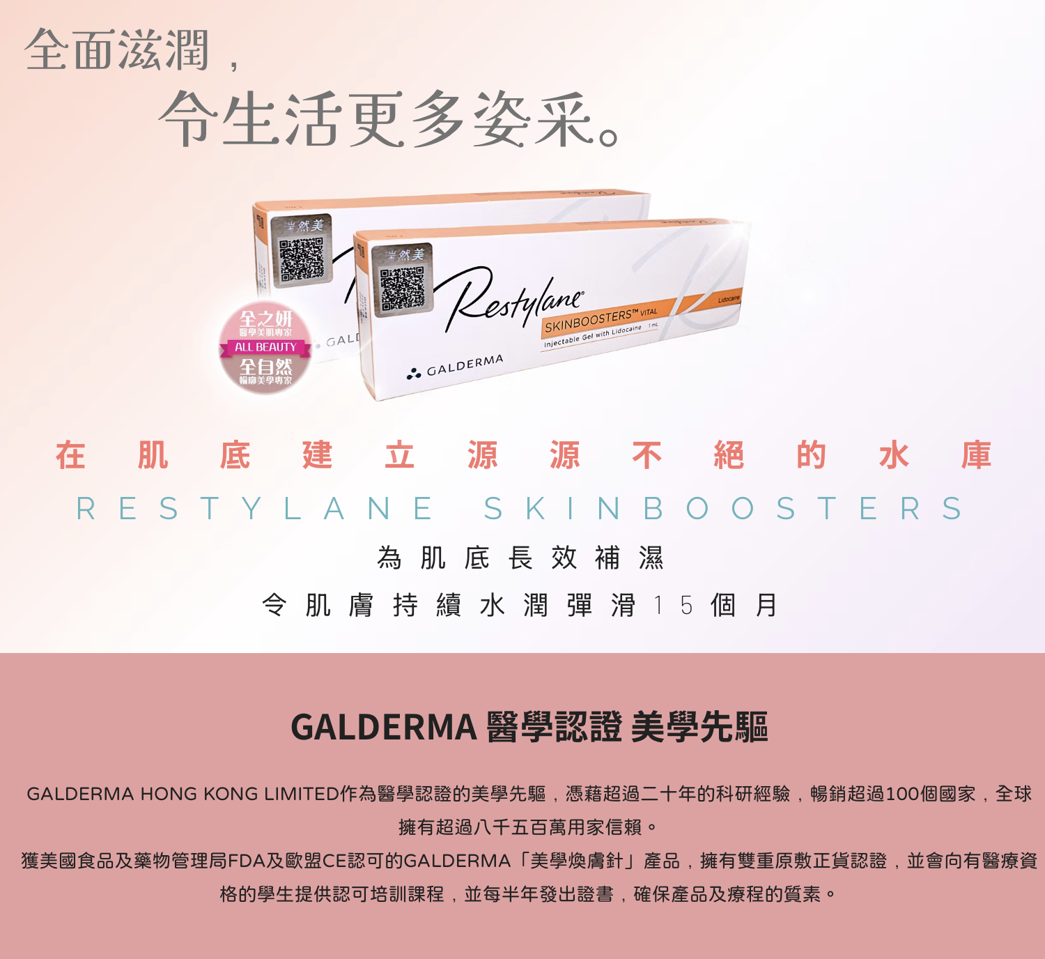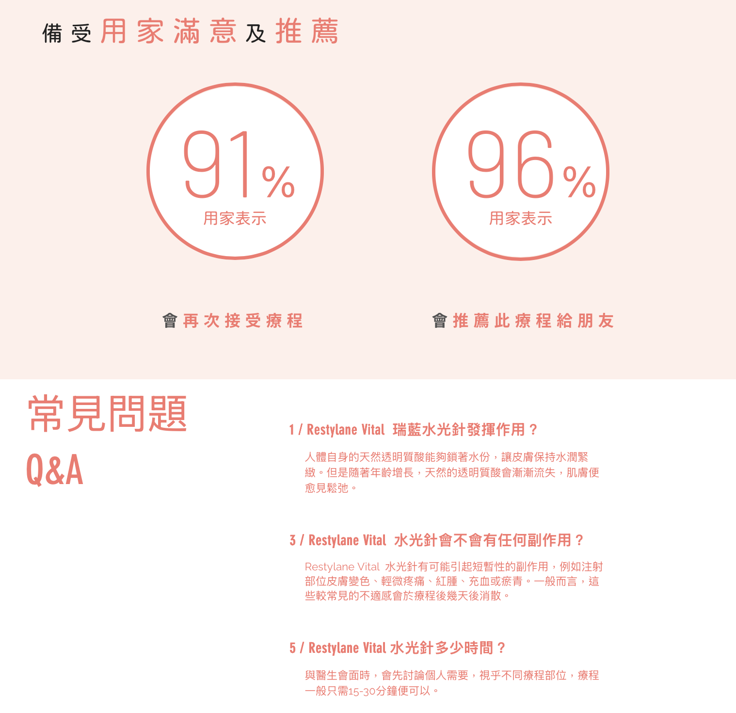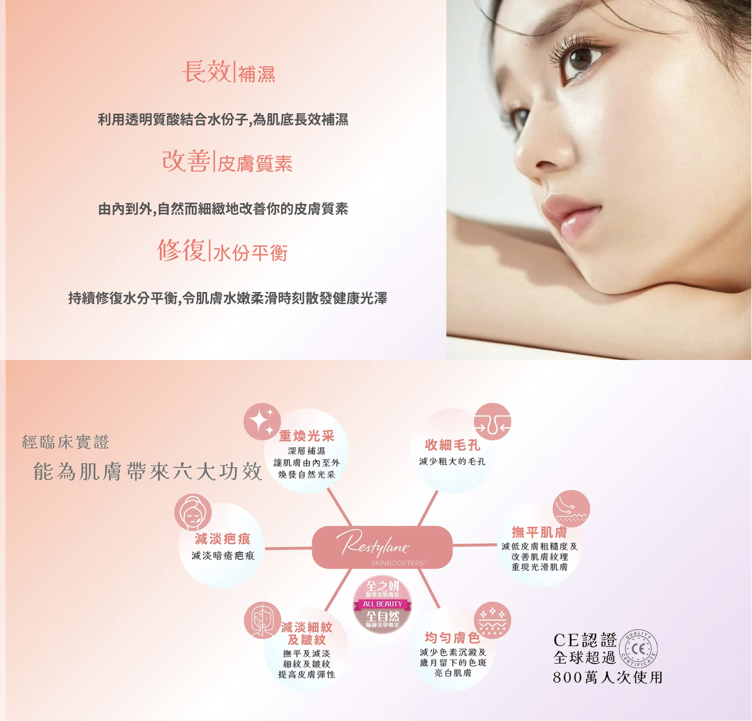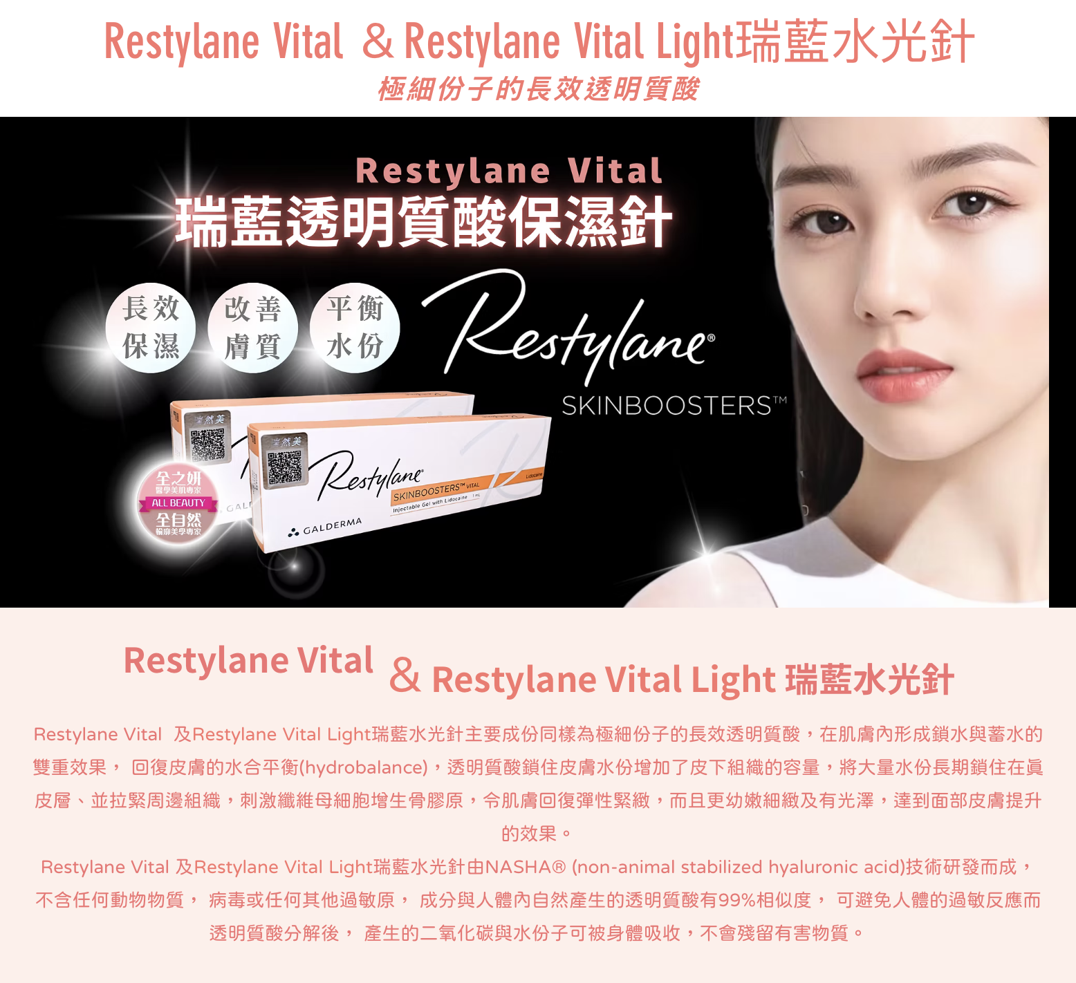 Restylane Vital Light瑞藍水光針主要成份同樣為極細份子的長效透明質酸,在肌膚內形成鎖水與蓄水的雙重效果, 回復皮膚的水合平衡(hydrobalance),透明質酸鎖住皮膚水份增加了皮下組織的容量,將大量水份長期鎖住在真皮層、並拉緊周邊組織,刺激纖維母細胞增生骨膠原,令肌膚回復彈性緊緻,而且更幼嫩細緻及有光澤,達到面部皮膚提升的效果。