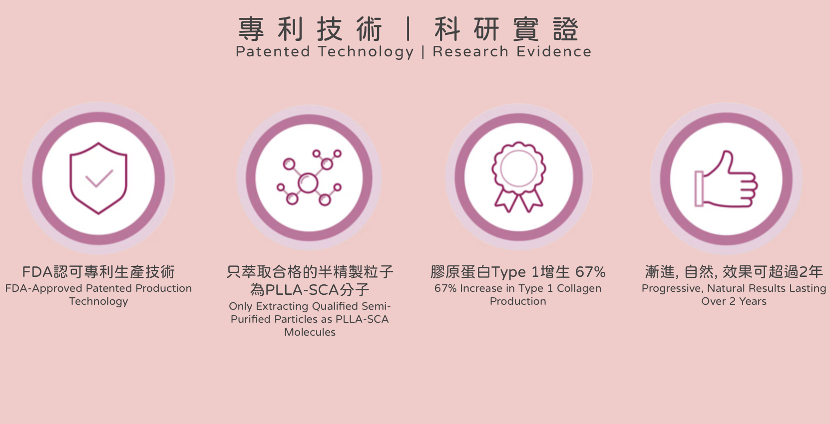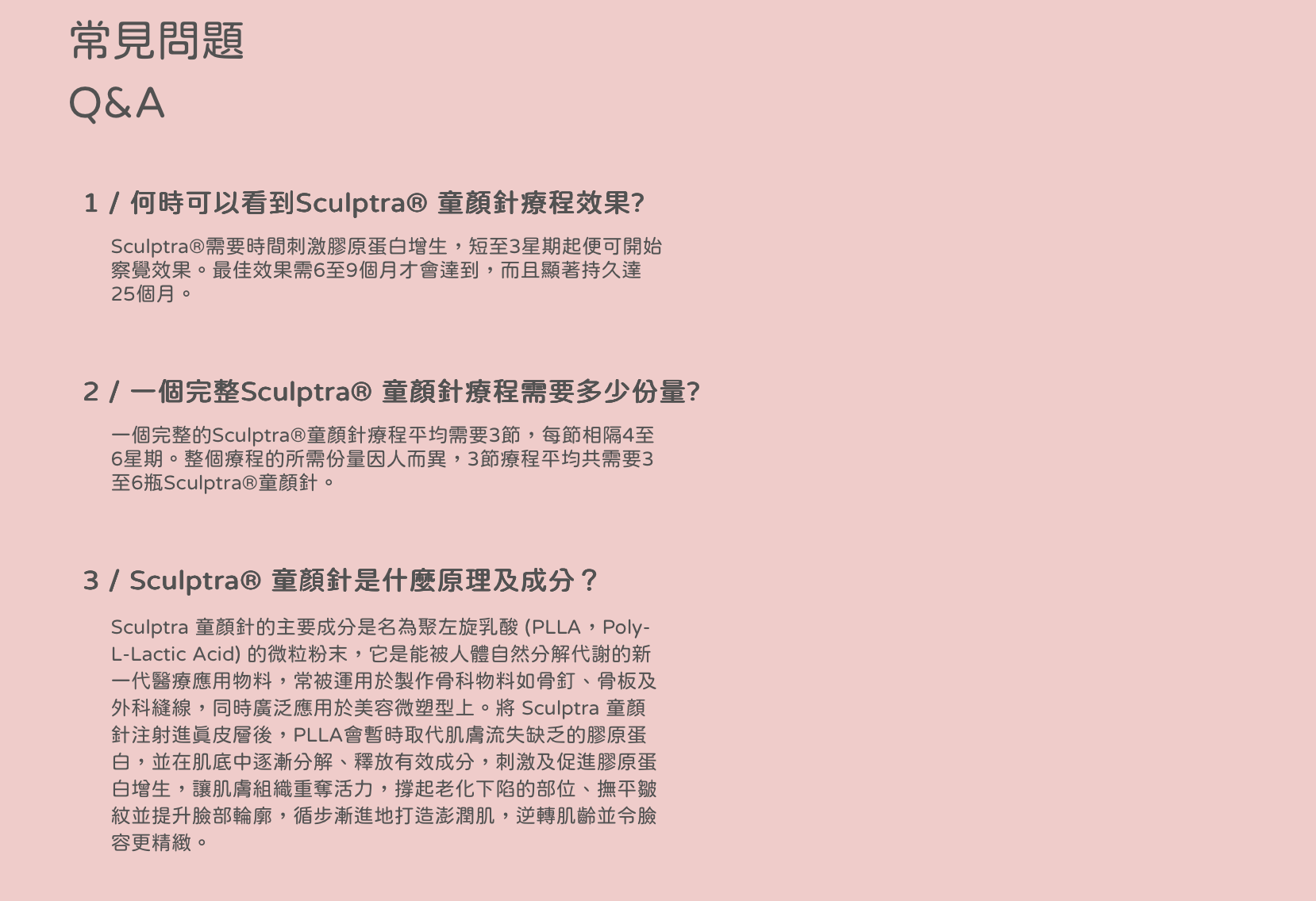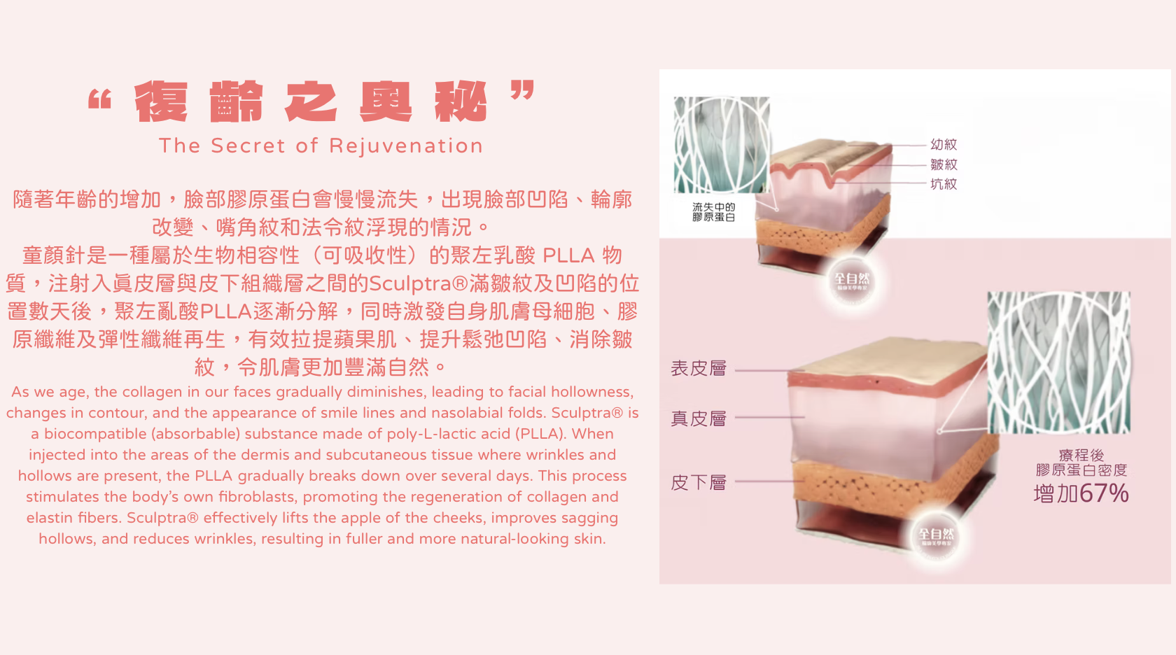 Sculptra® 童顏針是一種屬於生物相容性(可吸收性)的聚左乳酸 PLLA 物質,被醫學界使用已經超過三十年﹐能被人體自然分解吸收,已證實可以刺激皮膚的纖維母細胞,增加膠原纖維和彈性纖維的製造,促進膠原蛋白自生。Sculptra® 安全性非常高,已獲美國食物藥品監督管理局 (FDA) 以及其他國家衛生當局核准認可。
