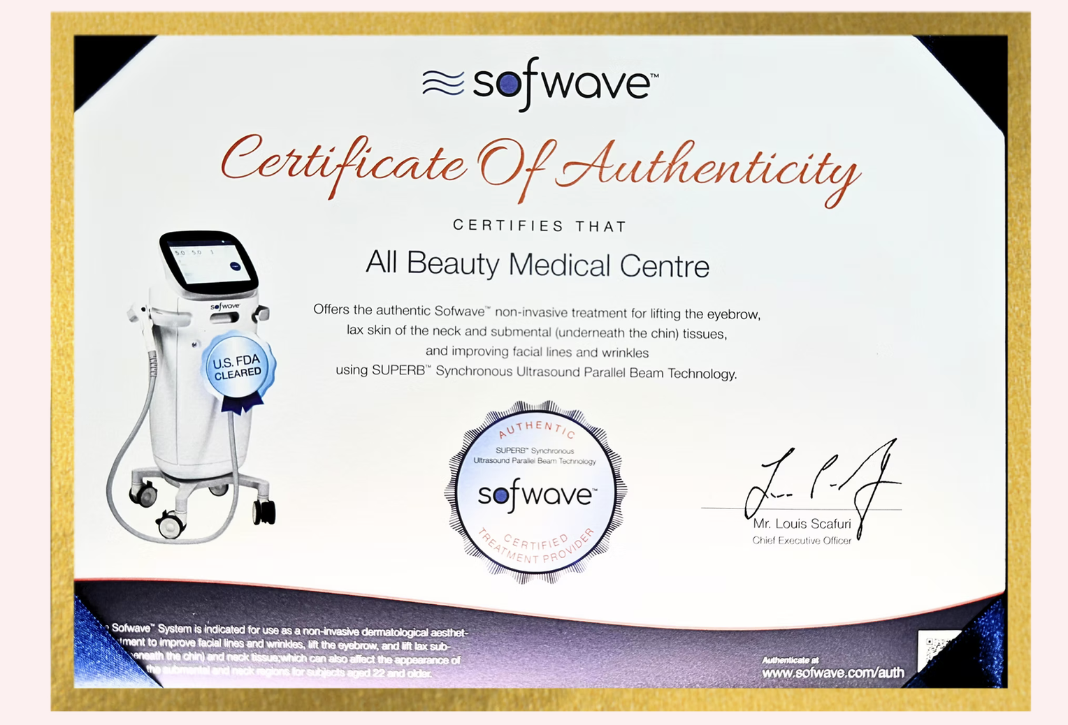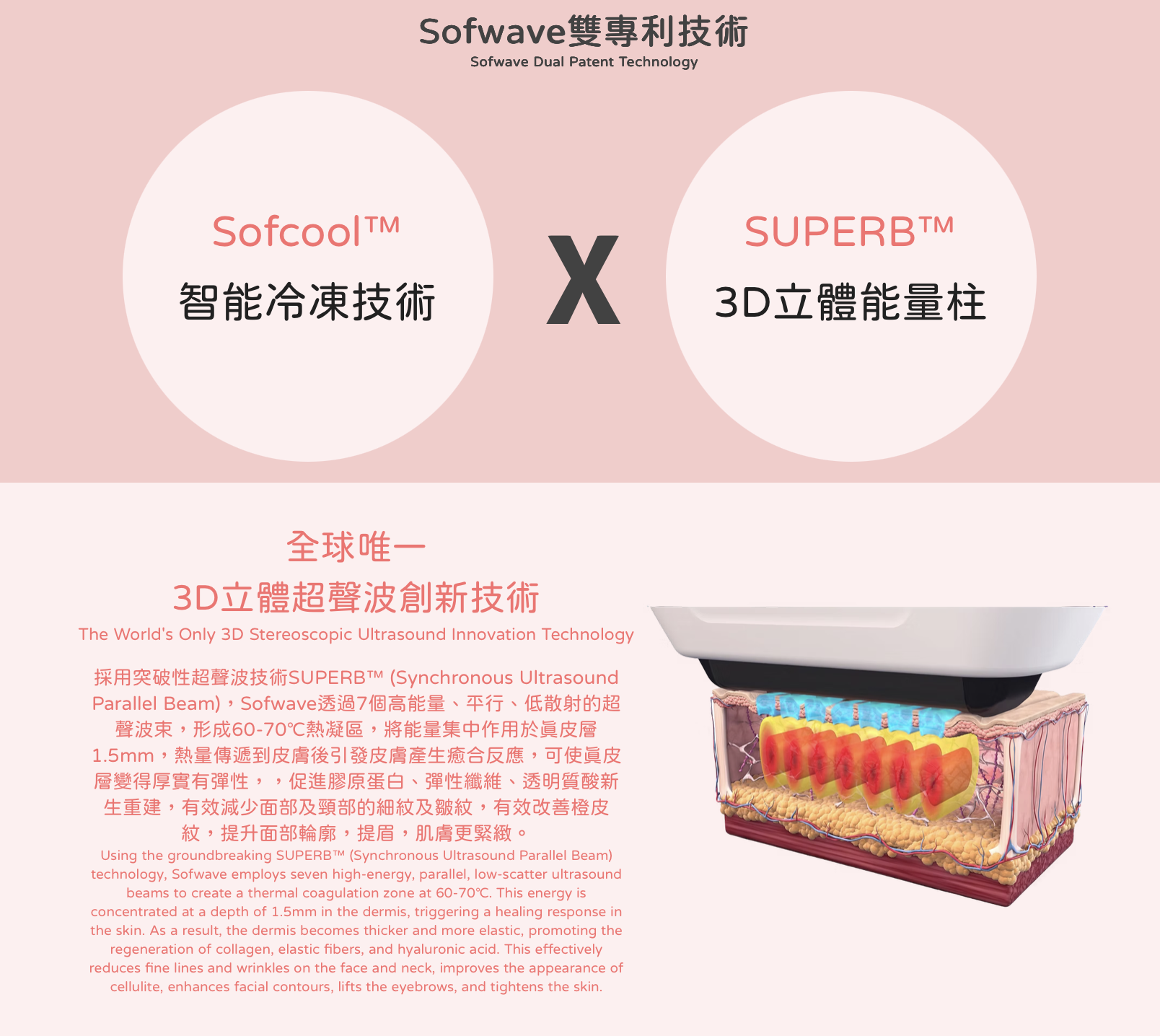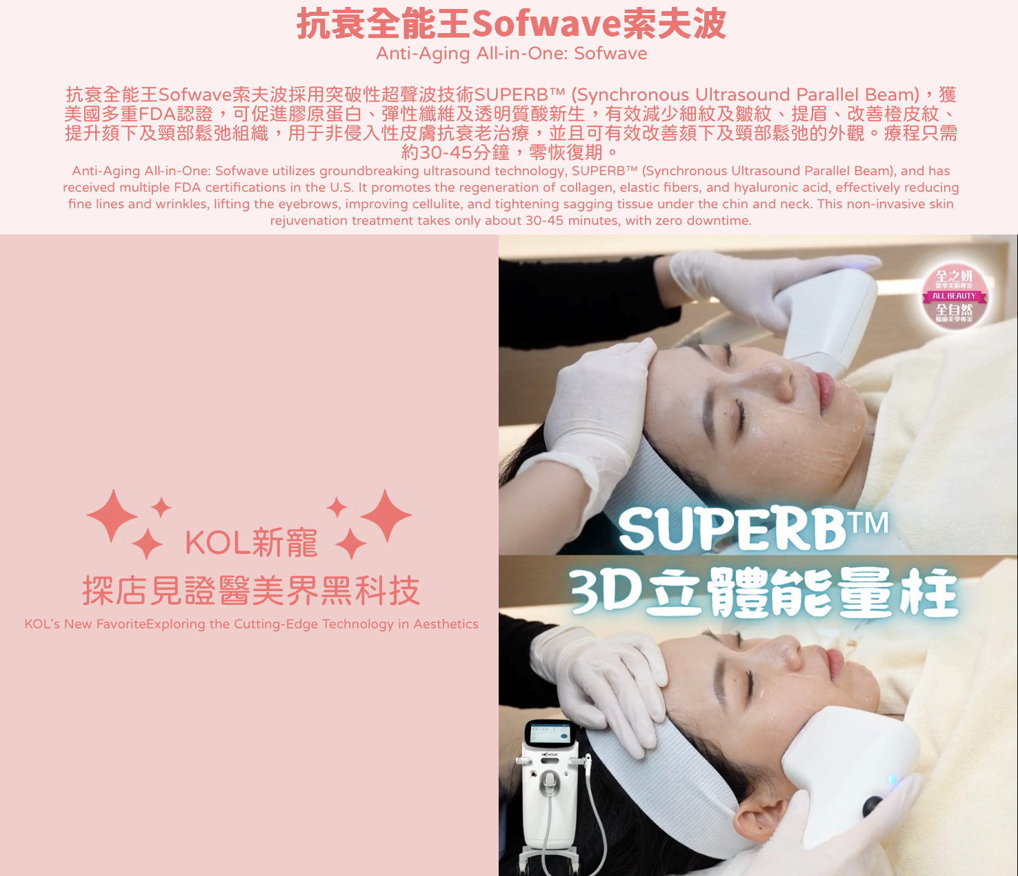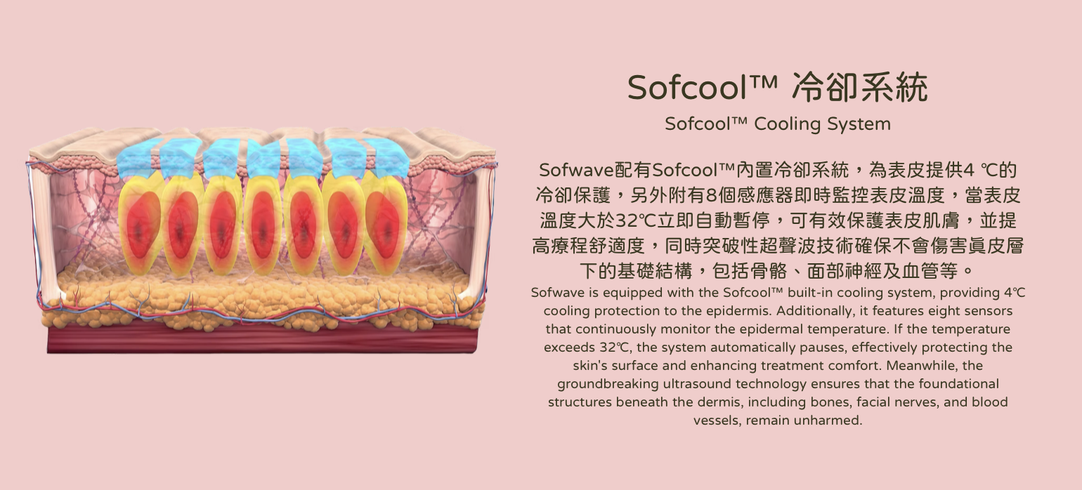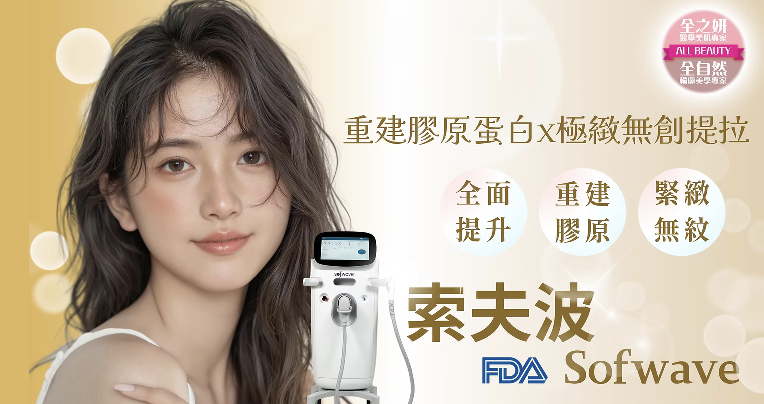 抗衰全能王Sofwave索夫波採用突破性超聲波技術SUPERB™ (Synchronous Ultrasound Parallel Beam),獲美國多重FDA認證,可促進膠原蛋白、彈性纖維及透明質酸新生,有效減少細紋及皺紋、提眉、改善橙皮紋、提升頦下及頸部鬆弛組織,用于非侵入性皮膚抗衰老治療,並且可有效改善頦下及頸部鬆弛的外觀。療程只需約30-45分鐘,零恢復期。