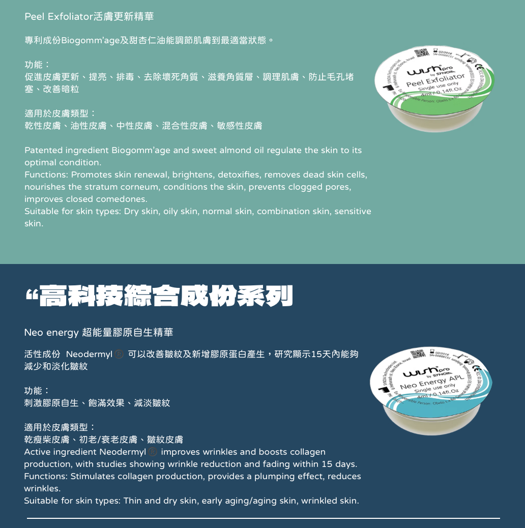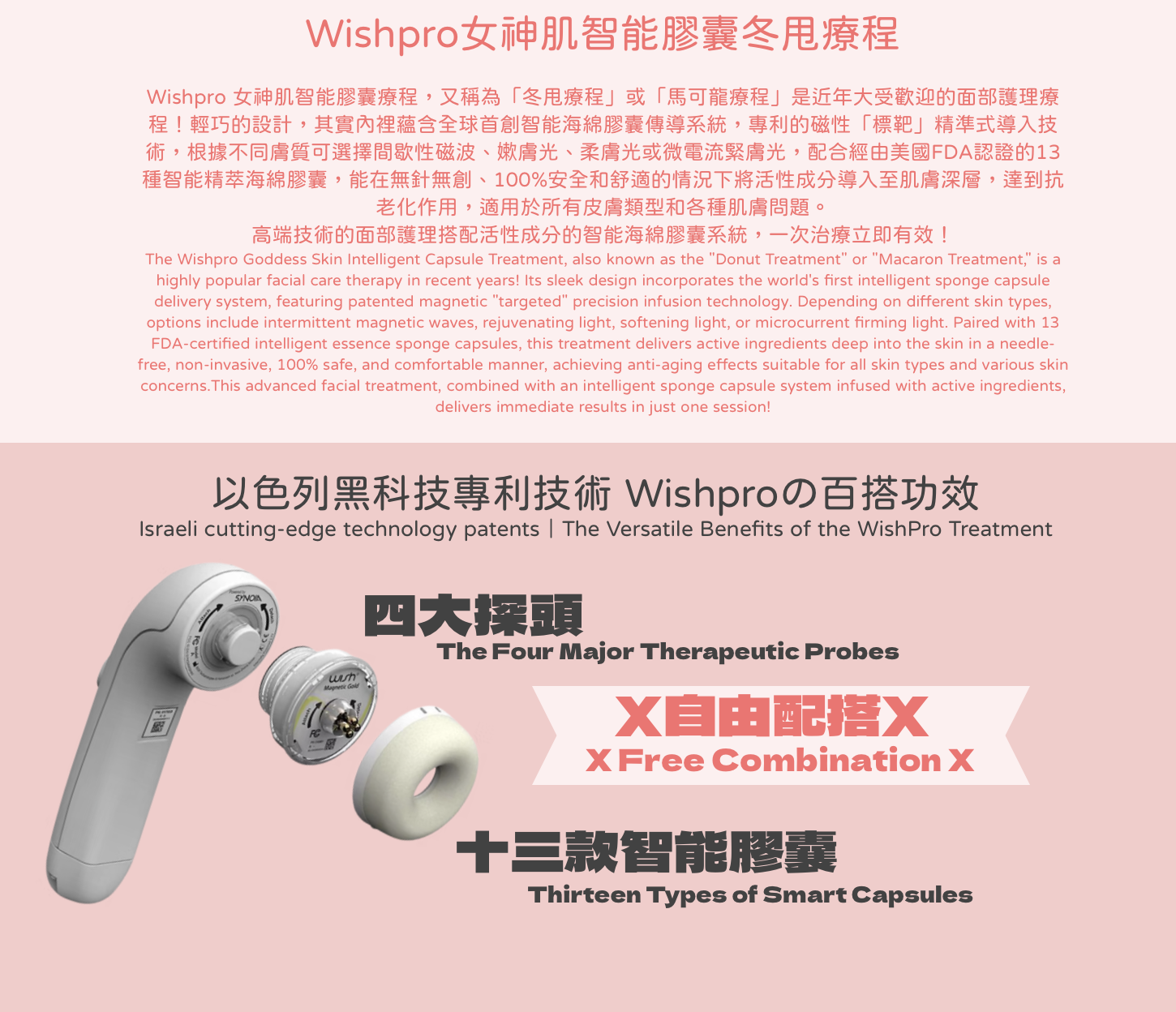 Wishpro 女神肌智能膠囊療程,又稱為「冬甩療程」或「馬可龍療程」是近年大受歡迎的面部護理療程!輕巧的設計,其實內裡蘊含全球首創智能海綿膠囊傳導系統,專利的磁性「標靶」精準式導入技術。